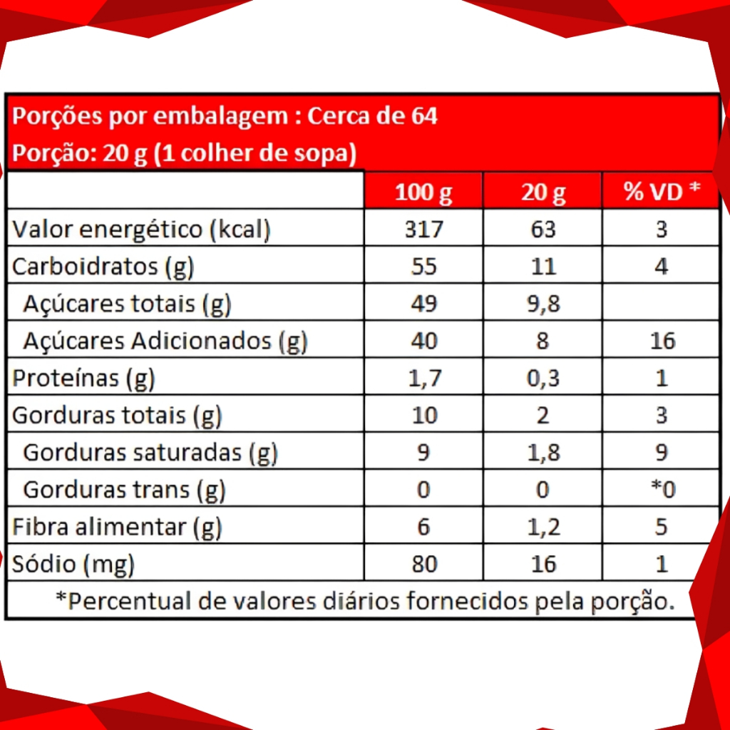Não é por menos que essa sobremesa faz sucesso. Desde 1980, essa virou tradição em todas as mesas do Brasil. Ingredientes: Polpa de Coco, açúcar, glucose e sal. Conservador INS 202 e INS 223. NÃO CONTÉM GLÚTEN. Somos uma loja especializada em artigos de festa, confeitaria, embalagens e atacado em doces com lojas físicas no estado de São Paulo, desde 2002. Imagens meramente ilustrativas, de acordo com nossos fornecedores que nos fornecem. Todas as Informações divulgadas são de responsabilidade do fabricante/fornecedor.