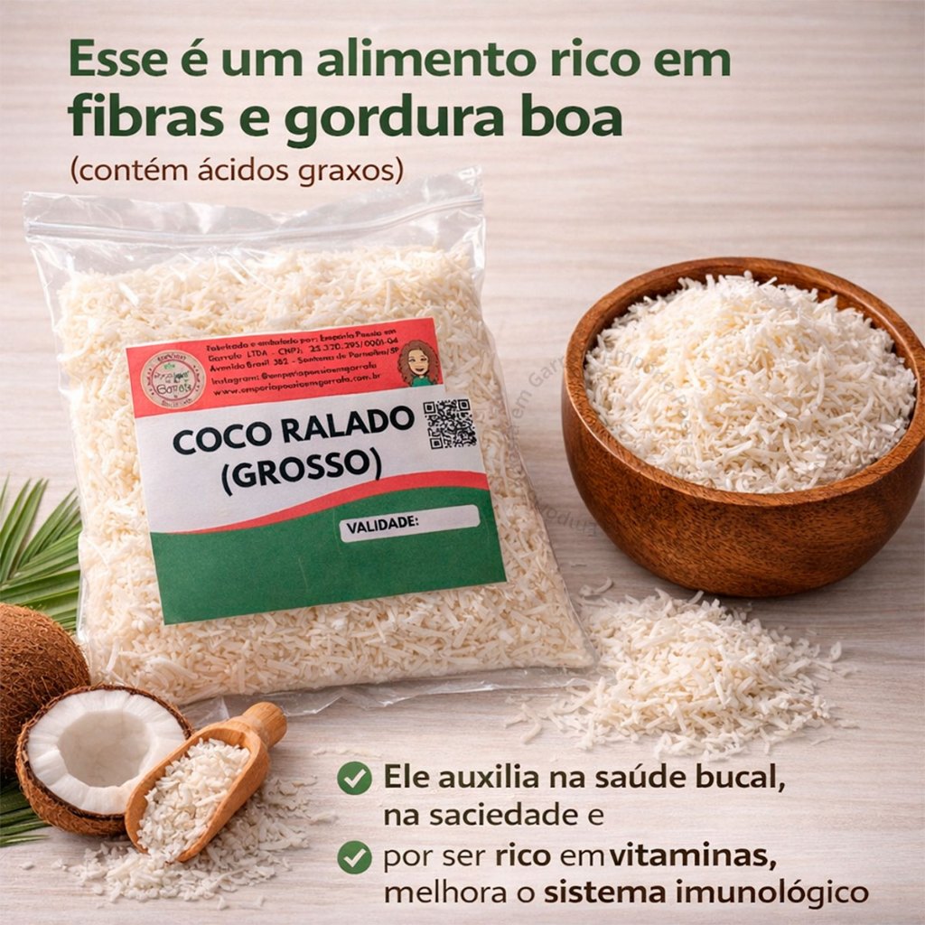COCO RALADO GROSSO 100% NATURAL 🥥 Mais sabor, mais rendimento e qualidade que você vê! ✔ Textura grossa e macia — ideal para receitas que pedem destaque ✔ 100% natural — sem açúcar adicionado ✔ Rico em fibras e gorduras boas ✔ Perfeito para bolos, doces, sobremesas e receitas fitness ✔ Produto fresco, embalado com cuidado 🔥 DISPONÍVEL EM VÁRIOS TAMANHOS: 250g | 500g | 1kg | 2kg 👉 Escolha o ideal para sua necessidade 💡 POR QUE COMPRAR ESSE COCO? Porque você não quer um coco seco e sem sabor… Você quer qualidade, frescor e resultado na receita. 🚀 IDEAL PARA: • Bolos e recheios • Doces e sobremesas • Uso profissional ou doméstico • Quem busca uma alimentação mais natural ⚡ GARANTA O SEU AGORA Produto com alta procura — aproveite enquanto está disponível!