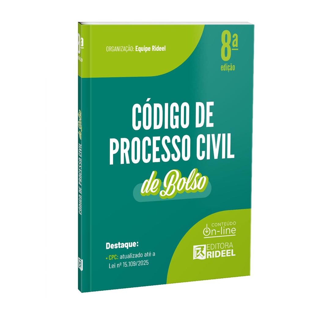 Conheça o produtoDestaques: CPC: atualizado até a Lei nº 15.109/2025 Atendendo aos anseios dos leitores por obras que tenham formato compacto, que permitam a rápida consulta ao texto legislativo plenamente atualizado e que, também, possuam baixo custo de aquisição, a Rideel criou a Coleção de Bolso. São livros que trazem o texto da Constituição Federal, dos principais códigos e da CLT em volumes independentes. Com diagramação pensada para proporcionar leitura agradável, notas remissivas elaboradas por especialistas em cada área, diversos facilitadores de consulta, como índice sistemático e detalhado índice alfabético-remissivo, são obras fundamentais para acadêmicos e operadores do Direito. A coleção abrange as principais áreas do Direito e é composta de 8 títulos: Constituição Federal, Código Civil, Código de Processo Civil, Código Penal, Código de Processo Penal, Consolidação das Leis do Trabalho, Código Tributário Nacional e Código de Trânsito Brasileiro. Tradição, qualidade editorial e preço acessível, esta é a Coleção de Bolso da Editora Rideel! Atualizações publicadas até 31-10-2026 disponíveis gratuitamente.