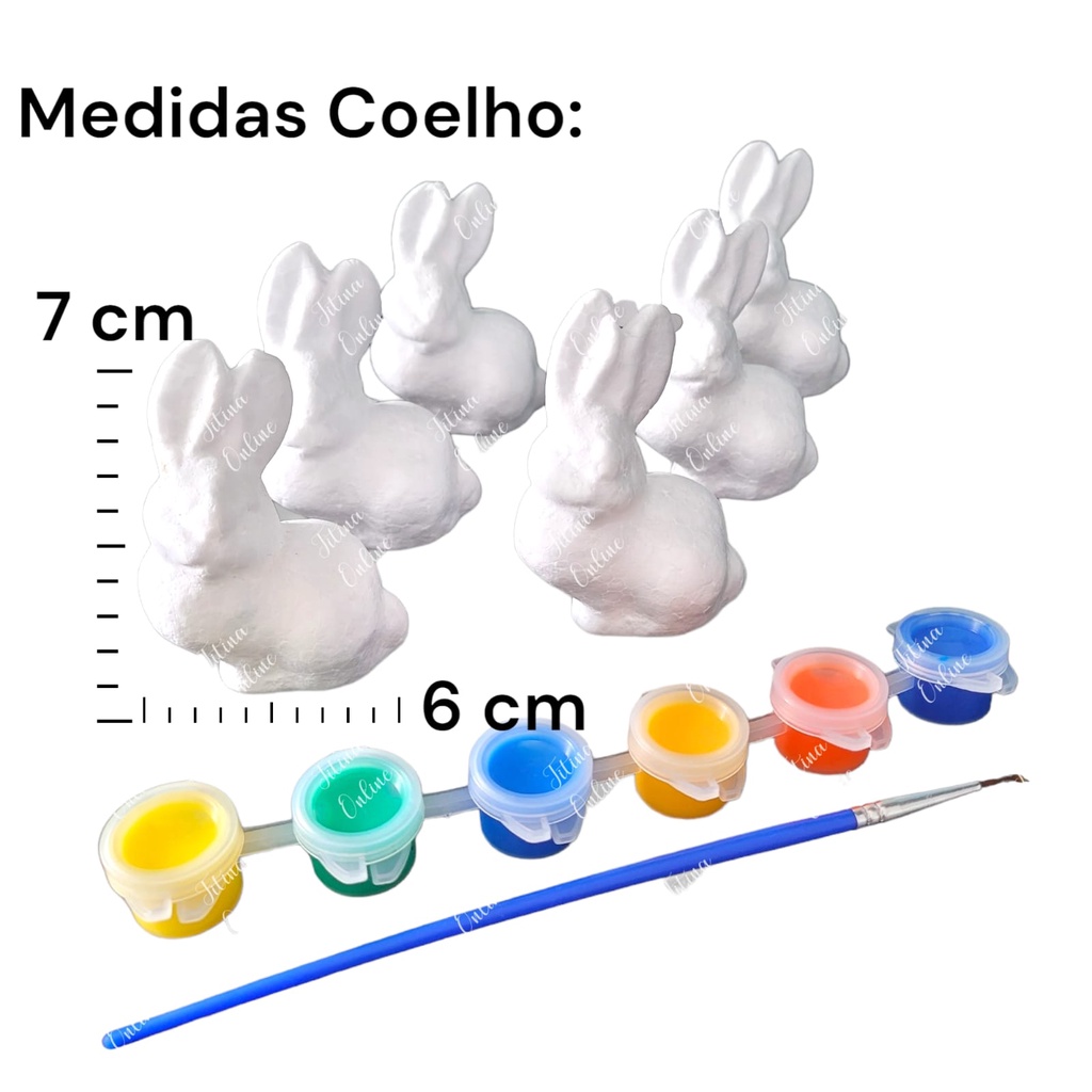 APROVEITE NOSSOS LINDOS PRODUTOS PARA DEIXAR SUA PÁSCOA AINDA MAIS ENCANTADORA. A Páscoa é uma época muito mágica para as crianças assim como o natal. É muito importante que os pais tornem essas datas comemorativas especiais para os filhos. A infância se torna ainda mais marcante com esse faz de conta que é os coelhos da Páscoa. Por isso trouxemos para essa data, nossa linha de pintura para as criança, pensando no lúdico e tornando a páscoa ainda mais divertida para elas. Benefícios: - Ideal para diversão da criança. - Trás a ludicidade. - Desenvolve a coordenação motora. - Excelente para dar de presente nesta páscoa. - Ajuda a criança expressar sentimentos através da arte. - Diversão garantida. - ACOMPANHA UM LINDO AGRADO PARA VOCÊ CLIENTE ESPECIAL. Descrição do produto: - kit 6 coelhinhos de isopor maciço. - 6 potinhos a base d´água. - 1 pincel. Medidas do coelhinho: - Altura: 7 cm. - comprimento:6 cm. Atenção, a tinta não mancha a roupa, sai lavando a roupa.