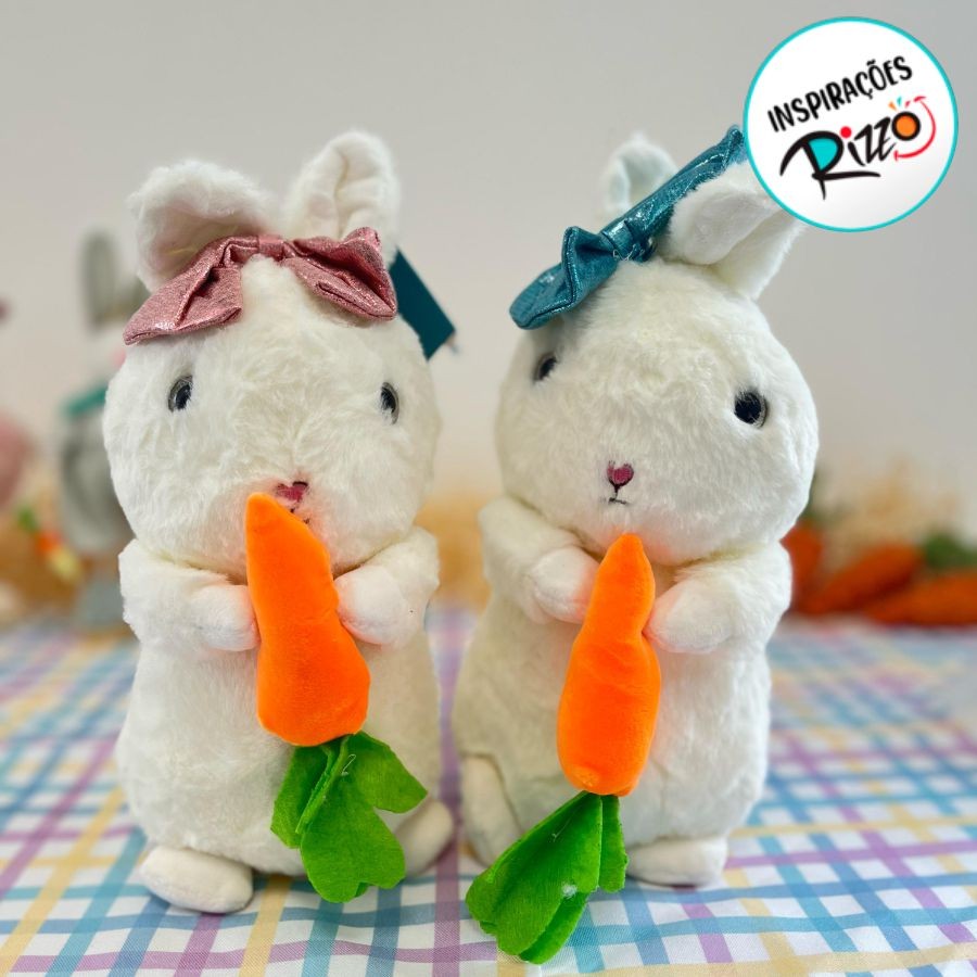 Coelho de Pelúcia Branco Segurando Cenoura com Laço Rosa - 25cm - 1 unidade - Rizzo