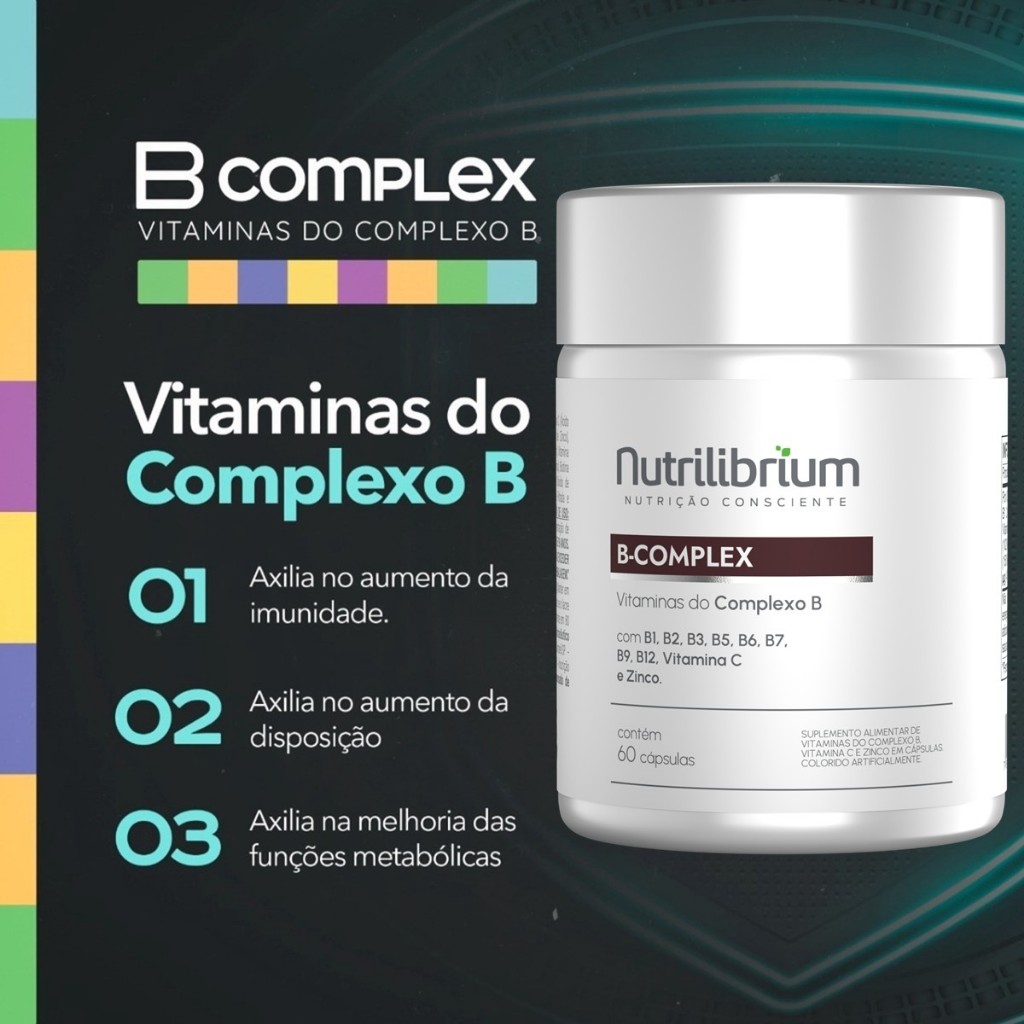 COENZIMA Q10 E VITAMINA E INGREDIENTES: Coenzima Q10, Vitamina E (Acetato de DL-alfa-tocoferol) e Antiumectantes Talco Farmacêutico. INGREDIENTES DA CÁPSULA: HPMC (hidroxipropilmetilcelulose), Água purificada e Corante. NÃO CONTÉM GLÚTEN. SUGESTÃO DE USO: Sugere-se a ingestão de 2 (duas) cápsulas 1 (uma) vez ao dia. PRODUTO INDICADO PARA MAIORES DE 19 ANOS. ADVERTÊNCIAS: “ESTE PRODUTO NÃO É UM MEDICAMENTO.” “NÃO EXCEDER A RECOMENDAÇÃO DIÁRIA DE CONSUMO INDICADA NA EMBALAGEM.” “MANTENHA FORA DO ALCANCE DE CRIANÇAS.” “ESTE PRODUTO NÃO DEVE SER CONSUMIDO POR GESTANTES, LACTANTES E CRIANÇAS”. CONSERVAÇÃO: Manter em lugar fresco, não úmido e ao abrigo da luz. Não consumir o produto se o lacre de proteção estiver violado. Após aberto, consumir preferencialmente em 60 dias. ____________________________________________ B COMPLEX INGREDIENTES: Vitamina B6 (Cloridrato de Piridoxina), Vitamina C (Ácido Ascórbico), Vitamina B3 (Nicotinamida), Zinco (Bisglicinato de Zinco), Vitamina B5 (Pantotenato de Cálcio), Vitamina B2 (Riboflavina), Vitamina B1 (Nitrato de Tiamina), Ácido Fólico (Ácido Pteroilmonoglutâmico), Biotina (D-Biotina), Vitamina B12 (Cianocobalamina) e Antiumectante Dióxido de Silício. INGREDIENTES DA CÁPSULA: Gelatina, Água Potável Filtrada e Corante Dióxido de Titânio. NÃO CONTÉM GLÚTEN. SUGESTÃO DE USO: Consumir 1 (uma) cápsula 1 (uma) vez ao dia, ou conforme orientação de nutricionista e/ou médico. PRODUTO INDICADO PARA MAIORES DE 19 ANOS. ADVERTÊNCIAS: “ESTE PRODUTO NÃO É UM MEDICAMENTO.” “NÃO EXCEDER A RECOMENDAÇÃO DIÁRIA DE CONSUMO INDICADA NA EMBALAGEM.” “MANTENHA FORA DO ALCANCE DE CRIANÇAS.” CONSERVAÇÃO: Manter em lugar fresco, não úmido e ao abrigo da luz. Não consumir o produto se o lacre de proteção estiver violado. Após aberto, consumir preferencialmente em 80 dias.