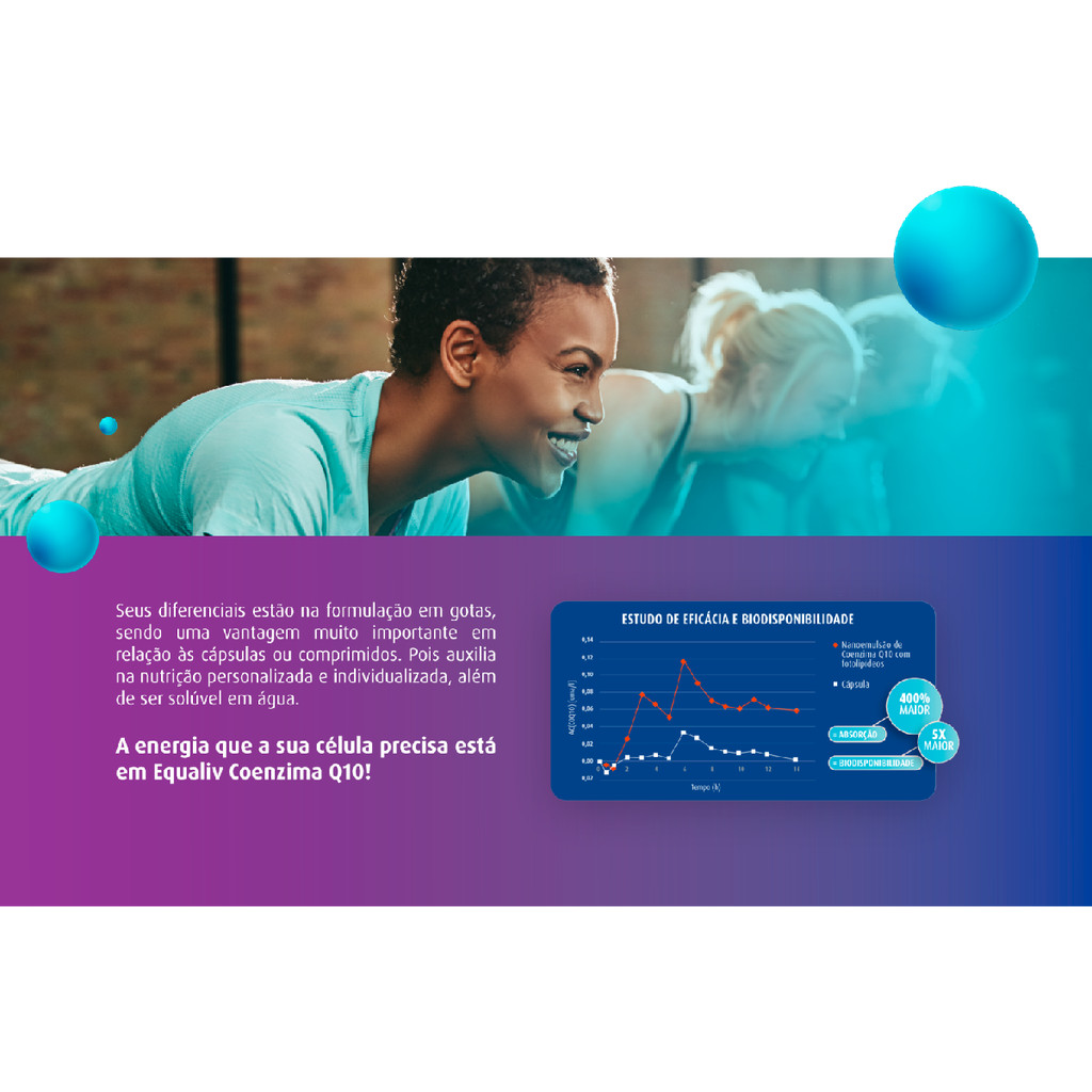 INFORMAÇÃO NUTRICIONAL Coenzima Q10 Solúvel em água 100% natural Alta absorção Maior biodisponibilidade Zero açúcares Zero glúten Zero lactose Vegano DESCRIÇÃO Equaliv Coenzima Q10 é um suplemento alimentar em gotas, desenvolvido com tecnologia de nano emulsão que favorece a absorção e biodisponibilidade. Sua formulação prática e versátil pode ser consumida pura ou diluída em líquidos, sendo uma opção vegana e livre de açúcares, glúten e lactose. INGREDIENTES Água, coenzima Q10, triglicerídeos de cadeia média, (agente de massa) glicerol e (emulsificante) lecitina de soja. ALÉRGICOS: CONTÉM DERIVADOS DE SOJA. NÃO CONTÉM GLÚTEN. MODO DE USO Consumir 10 gotas ao dia ou conforme orientação de médico ou nutricionista. Pode ser ingerido puro, com o auxílio de uma colher, ou misturado em água ou líquidos aquosos. Uso adulto. PORÇÃO DIÁRIA 0,6 g (10 gotas) – 100 mg