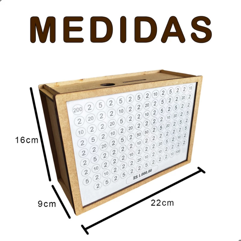 Organize suas economias e adicione um toque de elegância ao seu ambiente com o nosso Cofre Decorativo em MDF. Desenvolvido para ajudar você a alcançar suas metas financeiras, ele traz sofisticação e praticidade, permitindo que você personalize e acompanhe seu progresso com estilo. Descrição do Produto: Material de Alta Qualidade: Fabricado em MDF resistente e com acabamento de primeira linha, nosso Cofre é ideal para quem deseja funcionalidade e beleza. Compacto e elegante, ele se adapta a qualquer ambiente, seja na sala, quarto ou escritório, transformando-o em um espaço único e inspirador. Fácil Montagem e Acessórios Inclusos: Para uma experiência completa e prática, nosso Cofre acompanha: 💎Canetinha para Personalização: Customize seu cofre com metas e datas, dando um toque único. 💎Placa de Acrílico Transparente: Veja seu progresso de economia de forma visual e motivadora. 💎Manual de Montagem: Passo a passo prático, garantindo uma montagem rápida e sem complicações. ⚠️ Recomenda-se aplicação de cola (instantânea ou cola branca (PVA)) para melhor fixação dos encaixes e montagem da parte frontal Elegância com Versatilidade: Além de funcional, nosso Cofre é uma peça decorativa encantadora. Ideal para compor ambientes como quartos, salas de estar ou escritórios, ele é ao mesmo tempo sofisticado e versátil, ajudando a organizar o espaço e incentivando suas economias. Opções de Metas Financeiras: Disponível em três metas para você escolher conforme seus objetivos financeiros: ✔R$ 1.000,00: ideal para economias rápidas e metas de curto prazo. ✔R$ 5.000,00: perfeito para objetivos de médio prazo e estabilidade financeira. ✔R$ 10.000,00: indicado para grandes conquistas e economias de longo prazo. Presente Inspirador e Motivador: O Cofre é o presente ideal para amigos e familiares que desejam economizar e estabelecer metas financeiras. Perfeito para aniversários e ocasiões especiais, ele oferece uma maneira criativa e prática de inspirar a realização de objetivos financeiros. Transforme suas economias em conquistas com o Cofre Decorativo de MDF aliado perfeito para alcançar suas metas com elegância e organização!