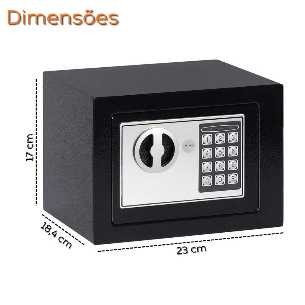 O anúncio contém: 01 Cofre Eletrônico Digital 02 Chaves de emergência 01 Kit de parafusos para fixação 01 Manual de instruções 04 Pilhas AA 1,5V Cofre Eletrônico Digital com Senha Numérica e Chave de Emergência Proteja seus objetos de valor com segurança, praticidade e tranquilidade. Este cofre eletrônico é ideal para armazenar dinheiro, documentos, joias e outros itens importantes, oferecendo um sistema de abertura seguro, instalação prática e ótimo aproveitamento interno. Benefícios Sistema de abertura por senha numérica configurável de 3 a 8 dígitos. Acompanha 2 chaves de emergência, garantindo acesso em situações imprevistas. Alerta de bateria fraca, evitando que o cofre fique inacessível. Sistema de bloqueio automático após tentativas incorretas de senha. Fixação segura, com furos internos e kit de parafusos inclusos. Compacto por fora e com excelente espaço interno útil. Ficha Técnica Material: Aço. Capacidade: 6L. Cor: Preto. Biometria: Não Dimensões externas aproximadas (AxLxC): 17cm x 18,4 x 23cm Dimensões internas aproximadas (AxLxC): 16,2cm x 16,2cm x 22,4cm Fabricante: Brinqlar. Indicado para: Residências, escritórios e comércios. Guardar dinheiro, documentos, joias e objetos de valor. Quem busca segurança com fácil instalação. Uso doméstico ou profissional. -Produto novo e em estoque. -Todos os produtos têm seguro contra extravio. -As cores do produto podem variar de acordo com o lote de fabricação. -Todas as informações são de responsabilidade do fabricante e/ou fornecedor.