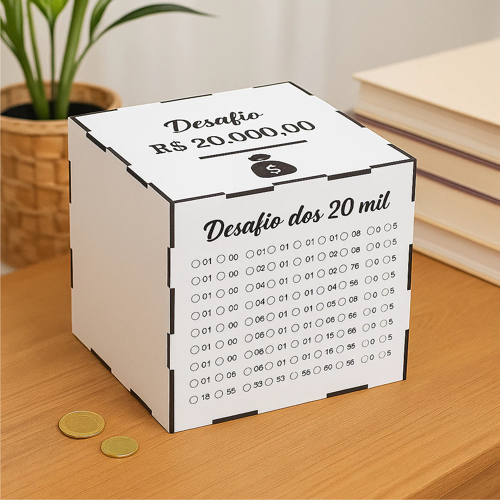 💰 Cofre Desafio de Economia – Junte Dinheiro de Forma Inteligente! Transforme o hábito de economizar em um desafio prático e motivador! Com este cofre, você acompanha sua evolução e se mantém focado nas suas metas financeiras. Escolha o desafio ideal para você: R$1.000, R$5.000, R$10.000 ou R$20.000 e avance passo a passo rumo aos seus objetivos. ✅ Produzido em MDF branco de alta qualidade ✅ Design moderno e compacto – tamanho aproximado 15x15x15 cm ✅ Valores gravados para facilitar o controle da economia ✅ Ajuda a criar disciplina financeira no dia a dia 🎯 Perfeito para quem deseja economizar com organização, foco e motivação, seja para viagens, sonhos pessoais ou emergências. 🛒 Adquira agora o seu Cofre Desafio e comece hoje mesmo a economizar!