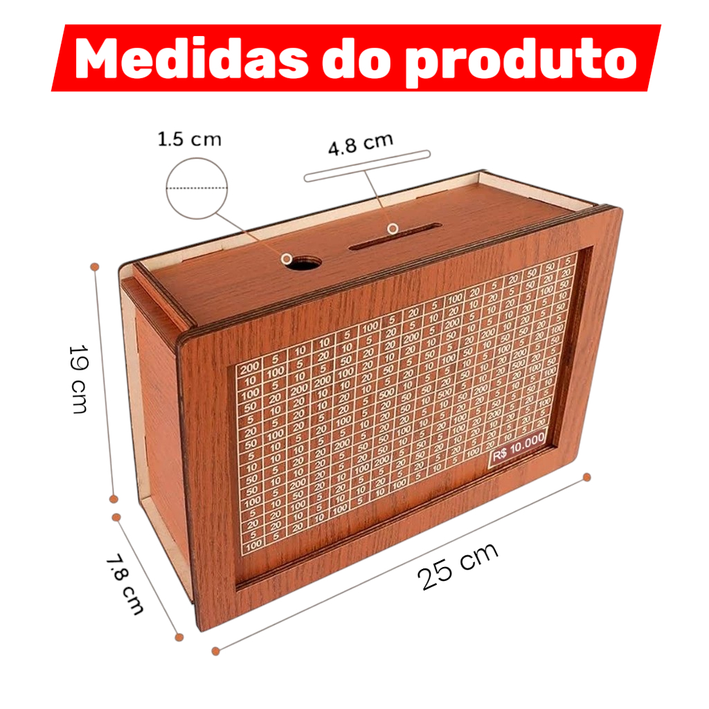 Transforme sua forma de poupar dinheiro! O Cofre Desafio Japonês em MDF é muito mais do que um simples cofrinho: ele é uma ferramenta prática e divertida para conquistar suas metas financeiras. Inspirado no tradicional método japonês de economia (kakebo), ele motiva você a guardar dinheiro de maneira organizada e visual, acompanhando cada conquista até alcançar R$1.000, R$5.000 ou até R$10.000. ✅ Detalhes do Produto: Material: MDF ecológico de alta qualidade Cor: Madeira natural Dimensões: 25 × 19 × 7.5 cm (compacto e elegante) Capacidade de desafio: até R$20.000 🌟 Benefícios: Estimula disciplina financeira de forma simples e prática Visual motivador: acompanhe sua evolução e não desista da meta Decoração criativa: peça minimalista que combina com qualquer ambiente Presente educativo para crianças, jovens ou casais que querem aprender a poupar Ideal para planos e sonhos: viagens, festas, estudos ou conquistas pessoais 💡 Dicas de Uso: Defina um valor para começar (R$1,00, R$5,00 ou mais) e siga a sequência do desafio Marque cada etapa cumprida e acompanhe seu progresso Deixe sempre em um lugar visível para reforçar sua motivação