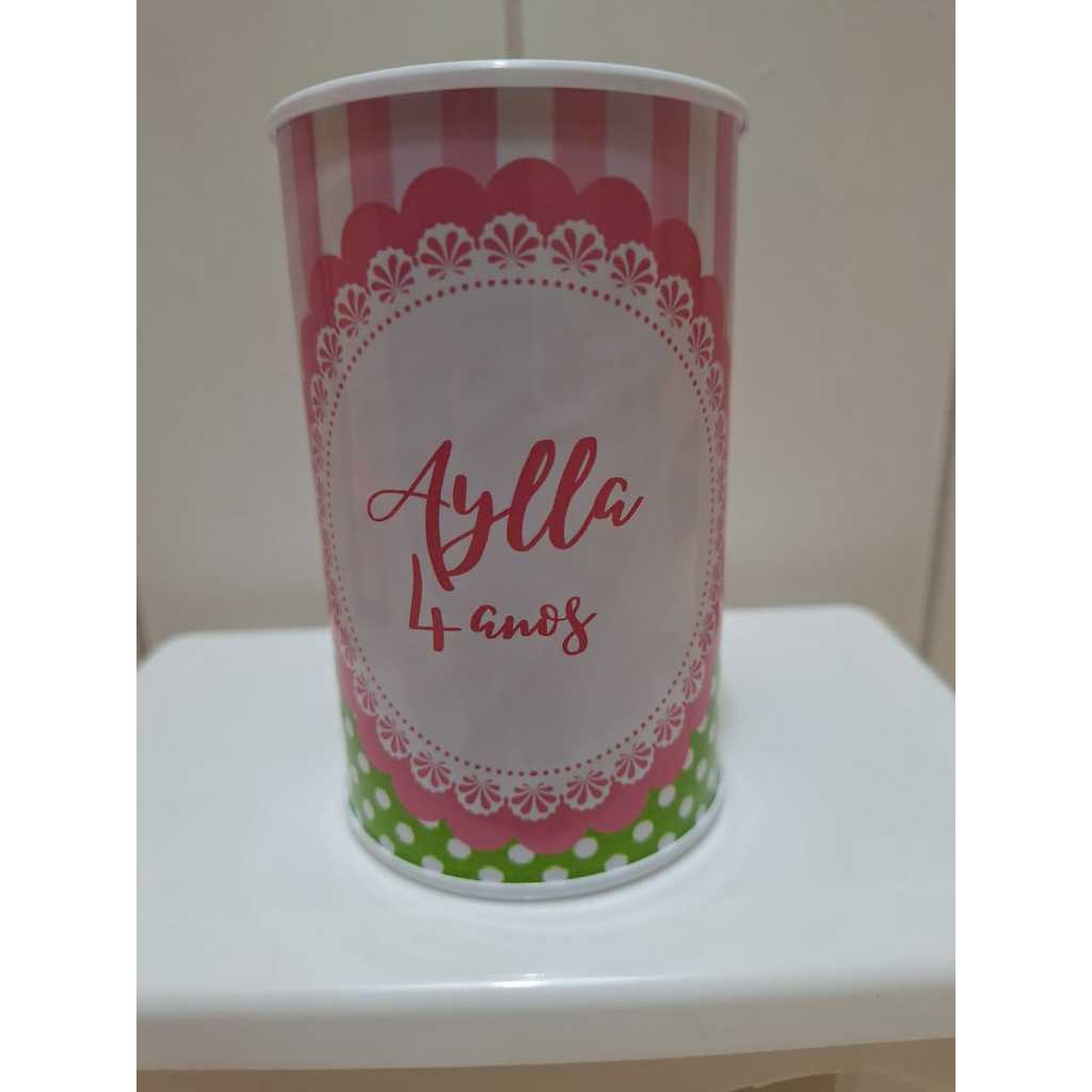 Cofrinho Personalizado no tema da sua festa, já prontinhos para entregar aos seus convidados: com embalagem transparente, lacinho nas cores que combinem com o tema se tiver disponível, se não será enviada na cor branca. Temos 2 opções: Simples: Sem embalagem, somente com rótulo Completo: Cofrinho com o rótulo + embalagem + lacinho Atenção: As cores das tampas e das fitinhas dos lacinhos serão enviadas nas cores que tiverem disponíveis , se não tiver disponível nenhuma cor do tema, será enviada na cor BRANCA. Após a compra enviar IMEDIATAMENTE NOME e IDADE DA CRIANÇA PARA PERSONALIZAR, SE NO PRAZO DE 12 HORAS não for enviado Nome e Idade, enviaremos SEM PERSONALIZAÇÃO DO NOME E IDADE, irá somente no tema. Se quiser em outro tema é só nos chamar aqui no CHAT