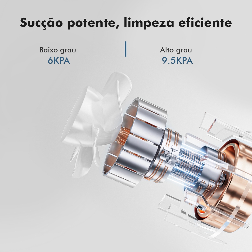 1. Parâmetros Técnicos Tipo: Aspirador sem fio com escova elétrica Potência: Motor de 120W com escovas Tensão: 22.2V Bateria: Pacote de 2000mAh Controle de velocidade: 2 velocidades ajustáveis Modo baixo: 6KPa (para limpeza diária) Modo alto: 9.5KPa (para sujeira resistente) Autonomia: 32 minutos no modo baixo 18 minutos no modo turbo Capacidade do reservatório: 0.75L Principais Vantagens Liberdade sem fio, leve e portátil: Design sem fio para limpar qualquer canto sem restrições de cabos. Peso de apenas 3.5kg , fácil de manusear. Poder de sucção profissional: Motor de 120W com duas velocidades (6KPa/9.5KPa), ideal para remover poeira, pelos de animais e sujeira incrustada. Bateria de longa duração: 2000mAh oferece até 32 minutos no modo econômico e 18 minutos no modo turbo. Copo grande de 0.75L: Reduz a frequência de esvaziamento, economizando tempo e esforço. Escova elétrica com LED: Ilumina cantos escuros (como debaixo de camas e sofás) para limpeza sem falhas. Design minimalista e moderno: Estilo elegante que combina com decorações contemporâneas. Vantagens Competitivas Operação sem fio → Facilidade de uso Alto poder de sucção → Eficiência na limpeza Bateria durável → Economia de tempo Reservatório grande → Menos interrupções Duas velocidades → Adaptável a diferentes superfícies Escova com LED → Limpeza precisa em áreas escuras Design elegante → Integração estética com a casa
