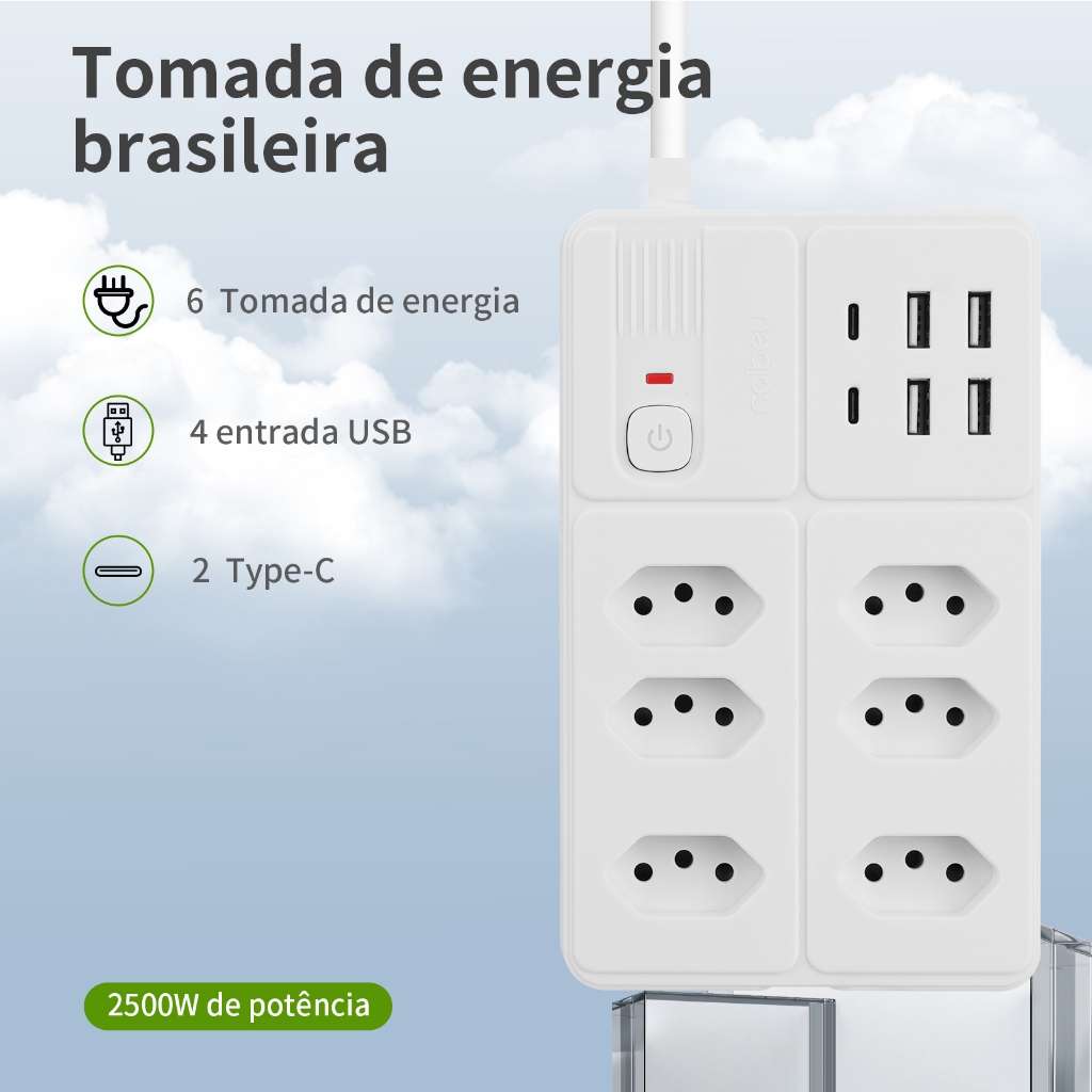COIBEU Extensão Filtro de Linha 6 Tomadas 4 USB 2 Tipo-C Bivolt Power 2500W 10A 2 metros