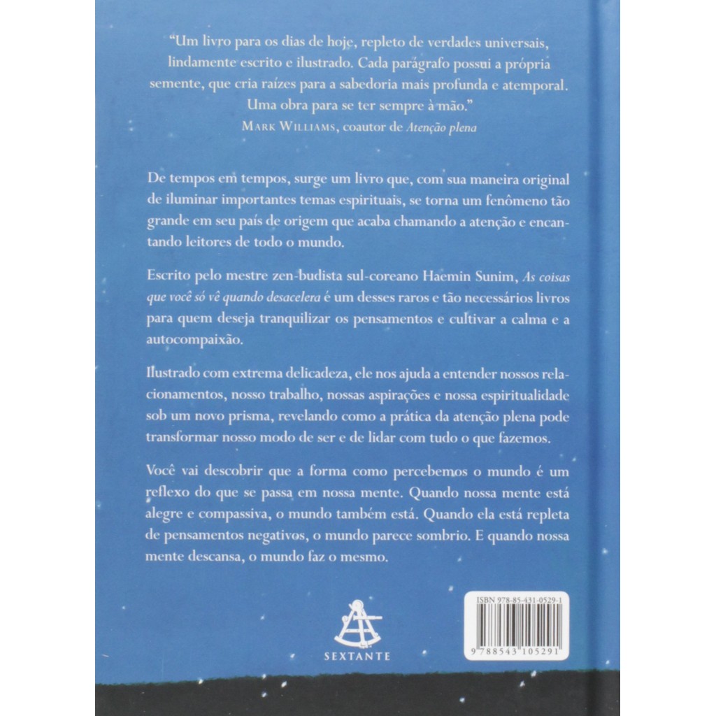De tempos em tempos, surge um livro que, com sua maneira original de iluminar importantes temas espirituais, se torna um fenômeno tão grande em seu país de origem que acaba chamando a atenção e encantando leitores de todo o mundo. Escrito pelo mestre zen-budista sul-coreano Haemin Sunim, As coisas que você só vê quando desacelera é um desses raros e tão necessários livros para quem deseja tranquilizar os pensamentos e cultivar a calma e a autocompaixão. Ilustrado com extrema delicadeza, ele nos ajuda a entender nossos relacionamentos, nosso trabalho, nossas aspirações e nossa espiritualidade sob um novo prisma, revelando como a prática da atenção plena pode transformar nosso modo de ser e de lidar com tudo o que fazemos. Você vai descobrir que a forma como percebemos o mundo é um reflexo do que se passa em nossa mente. Quando nossa mente está alegre e compassiva, o mundo também está. Quando ela está repleta de pensamentos negativos, o mundo parece sombrio. E quando nossa mente descansa, o mundo faz o mesmo. "Um livro para os dias de hoje, repleto de verdades universais, lindamente escrito e ilustrado. Cada parágrafo possui a própria semente, que cria raízes para a sabedoria mais profunda e atemporal. Uma obra para se ter sempre à mão." – Mark Williams, coautor de Atenção plena.