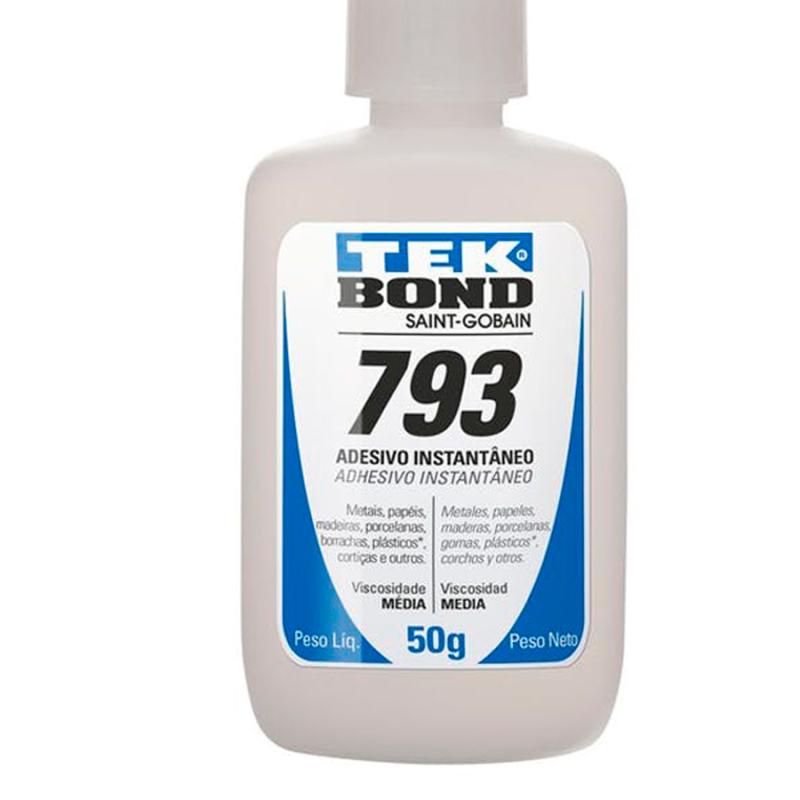 Cola Adesiva Instantânea Cianoacrilato 50 GR 793 Bico Anti Entupimento TEKBONDCola Adesiva Instantânea Cianoacrilato 50 GR 793 TEKBONDProduto da linha: CianoacrilatoAplicação: Ideal para adesão em materiais porosos como madeira, papel, couro ou tecido, aderindo também aos demais substratos com alta performance.Características:O adesivo 793 é recomendado principalmente para adesões que necessitam de alta velocidade de cura e excelente resistência.É um produto monocomponente a base de cianoacrilato e não requer mistura.O processo de cura inicia-se quando o adesivo entra em contato com a umidade.DADOS IMPORTANTES:Para obter um resultado satisfatório, as superfícies devem estar limpas, isentas de óleo e sujeira.Deve-se aplicar uma camada fina de adesivo em apenas 1(um) dos substratos a serem colados, pois o excesso prejudica o bom desempenho da colagem.Após aplicação do adesivo, devem-se manter as peças pressionadas por aproximadamente 10 segundos, onde a cura inicial estará concluída e a peça poderá ser manuseada com segurança.A cura total ocorrerá em 24 horas.Se necessária limpeza do excesso de adesivo deve ser feita com acetona ou MEK (metil etil cetona).Não adere a plásticos a base de poliolefinas ( PP), silicone e Teflon* ( *marca registrada Dupont)Para essa adesão utilize o Primer poliolefínico TEK BOND.Para manuseio do produto, recomenda-se a utilização de EPI’s.Para maiores informações de segurança, consultar a FISPQ do produto.Código de Fábrica: 10571002804Marca: TEKBONDPeso: 50 gr* Imagens meramente ilustrativas.
