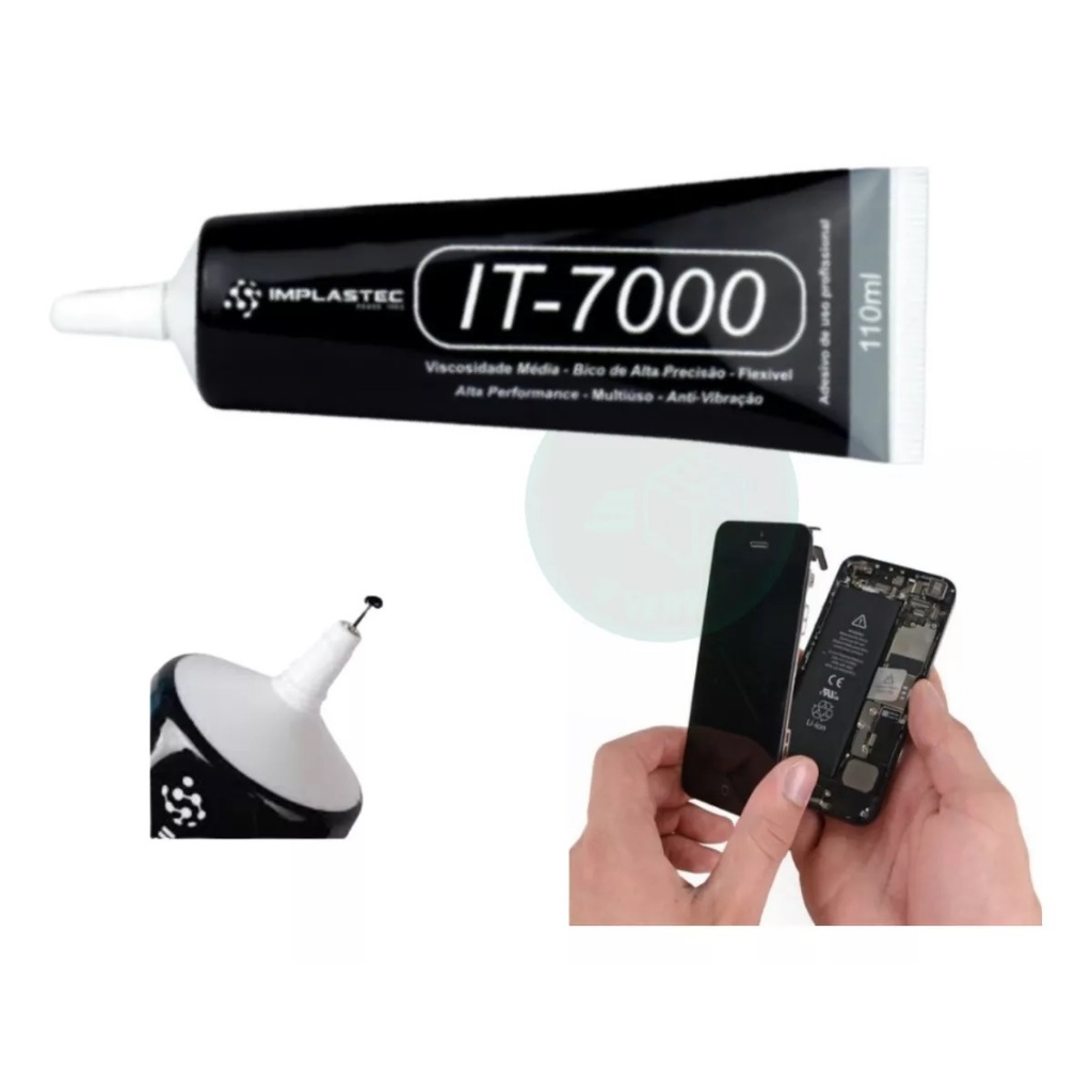 Cola IT 7000 Produto nacional e produzido pela IMPLASTEC, a mais respeitada empresa de insumos para eletrônica da América Latina. A IT 7000 da Implastec é uma cola de altíssima qualidade, muito utilizada na manutenção e troca de display em celulares e tablets. Pode ser utilizada em várias outras aplicações, incluindo a manutenção e fabricação de joias, por exemplo. Características: - Marca: Implastec - Aparência: Preto - Embalagem: 110ml - Viscosidade 25°C: 4500 cPs - Bico de Alta Precisão - Flexível - Alta Performance - Multiuso - Anti-vibração - Quantidade de sólidos: 49% - 52% - Composição: Solvente orgânico e resinas especiais Aplicação: - O produto é indicado para colagem da tela de telefone celular e tablet. Ainda, por ser um adesivo de contato pode ser utilizado em diversas aplicações como na fixação de componentes eletrônicos, artesanatos e pequenos reparos, recomendando-se testar a compatibilidade dos materiais. A superfície deve estar seca e limpa. Aplique no local adequado, conforme o reparo que está sendo realizado. Após o uso limpe o bico aplicador e feche a tampa. A cura parcial ocorre após 3 horas e total de 24 a 48 horas.