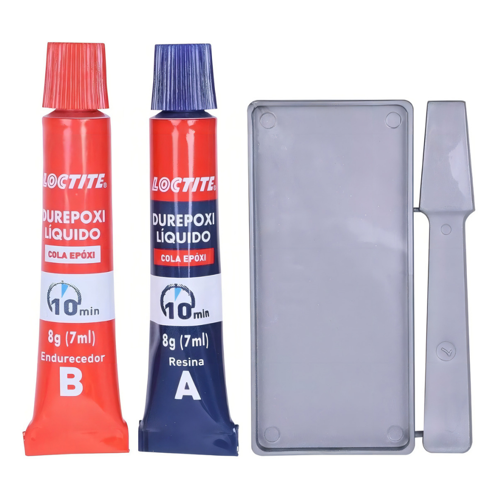 Cola Epóxi Durepoxi Liquido - Loctite, è um adesivo de tecnologia epóxi indicado para o uso profissional, domestico e artesanato. Pode ser utilizado para colagens e reparos dos mais variados materiais como : MADEIRA, VIDRO, PLÁSTICOS,COURO, BORRACHA VULCANIZADA, FIBRAS NATURAIS, PEDRAS,ALUMÍNIO, AÇO, FERRO, COBRE, LATÃO, PRATA E OURO. Possui tempo de secagem em 10 minutos; e resistência total em 8 horas. Dicas de uso As partes A (Resina) e B (Endurecedor) devem ser misturadas na mesma proporção, a fim de garantir eficiência do produto; As peças que receberão o adesivo devem estar limpas, livres de poeira, óleos, graxa, etc. afim de não impactar na aderência; Aplicar o adesivo de forma uniforme sobre as peças, Para peças aplicadas na vertical, manter-las apoiadas até a secagem inicial do adesivo; O Excesso de adesivo antes da secagem pode ser removido com álcool doméstico; depois de seco, apenas mecanicamente; Caso haja uma segunda utilização, manter a embalagem bem fechada, em local seco e arejado. Nunca inverta as tampas das embalagens.Lave bem as mãos após a utilização do adesivo.