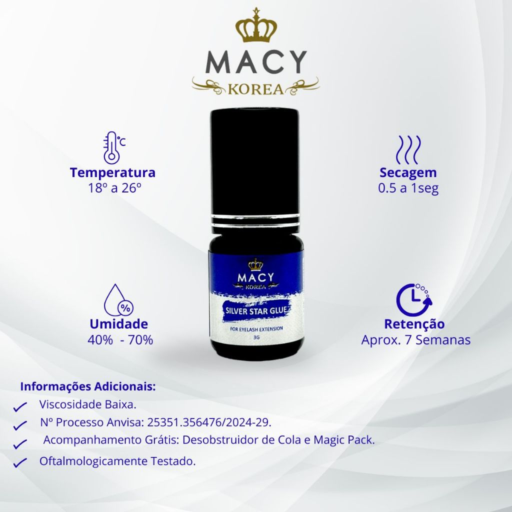 COLA MACY SILVER A Cola Macy Silver Macy Silver foi desenvolvida com a mais avançada tecnologia Nano B+, que proporciona eficiência excepcional para os profissionais de extensão de cílios. A tecnologia Nano B+ da cola Macy Silver traz uma retenção superior, mantendo os cílios firmes e no lugar por até 7 semanas. Sua polimerização rápida, com tempo de secagem de 0,5 a 1 segundo, agiliza o processo de aplicação, permitindo que os profissionais trabalhem de forma rápida e precisa. Uma das principais vantagens desta cola é o seu baixo odor, garantindo uma experiência mais agradável tanto para a extensionista de cílios quanto para a cliente. Informações adicionais: Registro Anvisa: 25351.356476/2024-29 Composição: Ethyl cyanoacrylate, Ethyl-2 Cyanocrylate, PMMA, CI77266 Retenção: Aproximadamente 7 semanas Tempo de curagem: 0,5 a 1 seg Temperatura ambiente: 18° a 26° graus Umidade indicada: 40% a 70% Viscosidade: Baixa Acompanhamento Grátis: Magic pack e Desobstruidor de Cola ATENÇÃO: Produto indicado somente para profissionais da área de extensão de cílios. O produto não é indicado para colar tufos e cílios postiços. A Sobelle não se responsabiliza por mau uso do produto. em caso de contato com a pele ou olhos, lave imediatamente com água corrente e consulte um médico.