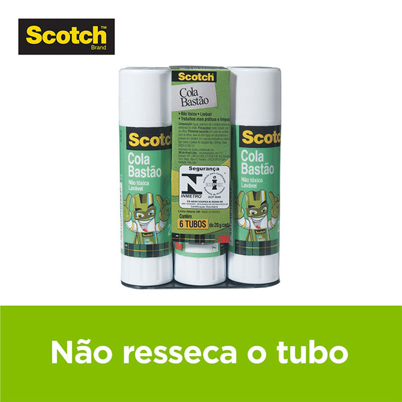 Cola bastão Scotch 20g - 3M A Cola em Bastão Scotch® é perfeita para o uso no escritório, casa ou escola, excelente para colagens de papéis, fotos e materiais semelhantes. Com qualidade Scotch®, ela não escorre, não resseca no tubo e pode ser lavada. Tem ótimo acabamento na colagem, fica transparente ao secar e não faz sujeiras. Seu rendimento é maior, pois o bastão de cola fica preso à base, evitando quedas e proporcionando o seu uso até o final. A Cola em Bastão Scotch® conta com tampa em design exclusivo, desenvolvida a fim de promover mais segurança durante o uso por crianças. Detalhes: - Não possui solvente. - Não faz sujeira. - Não resseca no tubo, é lavável e não tóxica. - Tampa maior visando mais segurança para o uso infantil.