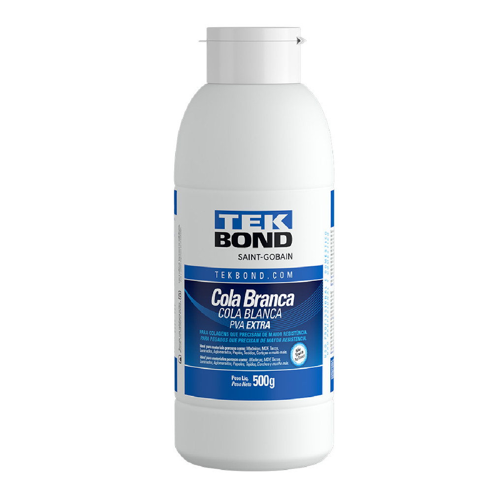 Cola Branca PVA Extra TekBond - 500 gramasCOLA BRANCA PVA EXTRA ARTESANATOOs adesivos PVA são os mais utilizados nos trabalhos de artesanato, pois são capazes de colar as mais diversas superfícies porosas como papel, papelão, madeira laminados, dentre outros. A PVA Extra é ainda mais resistente e possui um alto poder de adesão.CARACTERÍSTICAS:Adesivo à base de PVA – Acetato de Polivinila foi especialmente desenvolvido para colagens em madeira, porém seu uso se ampliou para os mais diversos tipos de superfícies, sendo amplamente utilizada nas mais diversas técnicas artesanais com segurança e acabamento perfeitos.INSTRUÇÕES DE USO:Limpe a superfície que será colada para que não contenha oleosidades ou poeira.Aplique uma camada uniforme do adesivo em uma das superfícies, em seguida una à outra parte e pressione.A adesão total acontece entre 24 a 48 horas dependendo do clima, quantidade de adesivo usado e o peso das peças a serem fixadas.DADOS TÉCNICOS:Aparência (visual): Líquido branco com odor característicoViscosidade a 25°C: 7.000 a 9.000Teor de sólidos: 45 a 47 %pH a 25°C: 4,00 a 6,00Densidade a 25°C: 1,02 a 1,07Aspecto do filme: Transparente e flexível