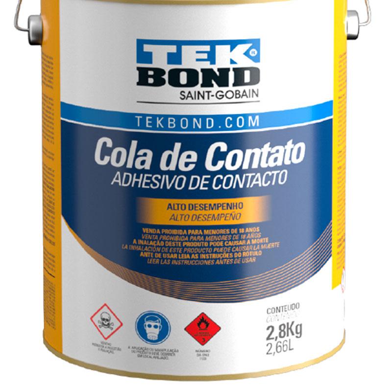 Cola de Contato 2,8 KG 24301002800 TEKBONDA Cola de Contato Tekbond é um adesivo de contato à base de borracha de policloropreno desenvolvido para a colagem de vários tipos de materiais entre si (ex.: madeira-madeira; couro-couro) ou combinados (ex.: madeira-couro).Fácil de usar, oferece secagem rápida, boa resistência à água e excelente resistência inicial.Indicada para a colagem de laminados decorativos, pisos de borracha, couro, metais, lambris e diversos materiais sintéticos em madeiras compensadas, aglomerados, MDF e diversos substratos.INSTRUÇÕES DE USO:Certifique-se de que as superfícies a ser coladas estejam secas e limpas (livres de poeira, gordura ou qualquer resquício de oleosidade).Caso a superfície de colagem não seja porosa ou nivelada, recomendamos que você lixe a peça para propiciar melhor ancoragem da cola.Mexa o adesivo antes de usar. Em seguida, aplique uma camada uniforme de cola em ambas as superfícies a ser coladas com uma espátula dentada, pincel de cerdas duras ou rolo de lã de carneiro. Para materiais mais porosos, é indicada uma segunda aplicação após 20 minutos da primeira demão.Aguarde o tempo de secagem da cola em ambas as superfícies de 15 a 30 minutos. Esse tempo pode variar conforme a temperatura e a ventilação do ambiente. OBS.: verificar com a ponta dos dedos se há aderência. Os dedos não devem ficar com resíduos da cola.Faça a união das peças apenas após a secagem, pressionando do centro para as pontas, evitando assim a formação de bolhas.Após o uso, feche bem a embalagem do produto, para prolongar sua vida útil.Não teste a resistência da colagem antes de 48 horas após a pressão.O tempo de cura total é de 7 dias.Recomendamos a realização de testes antes da aplicação final do produto.Não adere em materiais à base de polietileno, polipropileno e PTFE (resina antiaderente).PRECAUÇÕES:Não manuseie o produto antes de ter lido e compreendido todas as precauções de segurança.Não coma, beba ou fume durante a utilização deste produto.Use luvas de proteção, roupa de proteção, proteção ocular e proteção facial.Utilize apenas ao ar livre ou em locais bem ventilados.Obtenha instruções específicas antes da utilização.Lave as mãos cuidadosamente após o manuseio.A inalação frequente em concentrações elevadas deste produto, acima dos níveis permitidos pela legislação, pode causar dependência e danos irreversíveis à saúde.DADOS TÉCNICOS:Aparência (visual/ cor): Líquido viscoso âmbarViscosidade Brookfield a 23 ±2 °C: 2.100 ~ 3.100 cpsTeor de sólidos: 21±1%Odor: SolventeTemperatura de aplicação recomendada: 25±5 °CDensidade a 23 ±2 °C: 1,10 ± 0,02 g/mLCódigo: 24301002800Embalagem: 2,8 KGMarca: TekbondGarantia: 6 meses* Imagens meramente ilustrativas.