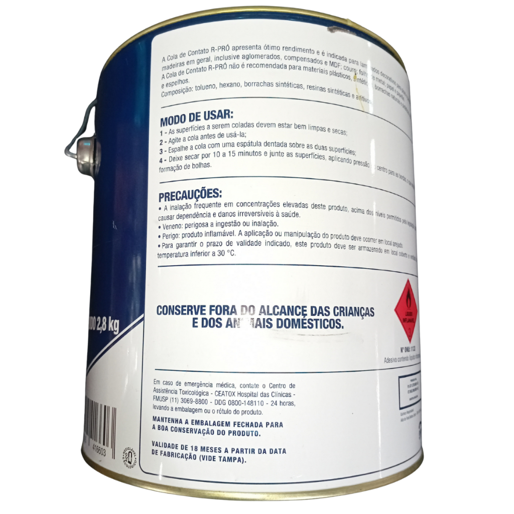 Descrição do produto:Cola de contato.Modelo: contatoMarca: KILLING R-PROComercializado: LataDIMENSÕES:Altura: 180mmLargura: 170mmPeso do produto: 2,8kgDescrição:- Os adesivos de contato são adesivos de alto desempenho que garantem uma colagem rápida e segura em aplicações com lâminas decorativas em chapas de MDF, compensados e aglomerados de madeira, fitas de borda, borracha, tecidos, espumas, metais e pisos (vinílico, carpete e emborrachado).Principais Características:- Apresentam alta resistência de colagem e muito boa resistência final e ao calor.- São adesivos versáteis com tack e tempo em aberto.Indicações de Uso:Indicado para uso em chapas de MDF, compensados e aglomerados de madeira, fitas de borda, borracha, tecidos, espumas, metais e pisos (vinílico, carpete e emborrachado).INFORMAÇÕES ADICIONAIS:Observações: Imagens meramente ilustrativas.As cores das amostras digitais podem divergir dos reais em função da resolução do monitor.