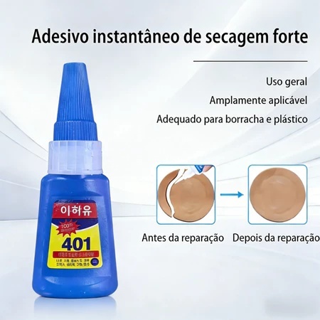 🛒 Informações do Produto 🎨 Cor: Transparente incolor ⚖️ Peso Líquido: 20g (frasco) ⏱️ Tempo de Manuseio: 30-50 segundos ⏳ Tempo de Pré-secagem: 2-5 minutos 📅 Validade: 12 meses 🛠️ Aplicação: Adequado para plástico, metal, borracha, etc. 🌡️ Armazenamento: Manter vedado, ao abrigo da luz, em local fresco e seco. ⚠️ Atenção: Evitar contato direto com a pele e olhos. 💡 Dica Importante ❄️ Temperaturas mais baixas aumentam o tempo de cura. 📝 Modo de Usar (Passo a Passo) Colar e reparar é muito simples! 🧹 PASSO 01: Limpe a superfície, mantenha-a seca e livre de impurezas. 🔓 PASSO 02: Abra a tampa e coloque o conta-gotas (bico alongado). 💧 PASSO 03: Aplique a cola uniformemente e pressione por 30-60 segundos. ⏲️ PASSO 04: Após a colagem, deixe descansar por 24 horas para uma fixação de qualidade. ✨ Por que escolher nossa cola? Qualidade Estável: Contamos com uma equipe de pesquisa e desenvolvimento profissional. Longa Duração: Garantia de qualidade e uso prolongado. Fácil Aplicação: O bico alongado (conta-gotas) permite uma aplicação precisa e prática. Não Amarela: O produto é transparente e permanece incolor após a secagem. 🌿 Ecológico e Baixo Odor: Pode usar com tranquilidade. Alta Resistência: Oferece ótima aderência. 🔍 Aplicações Versáteis A cola 401 é um adesivo transparente adequado para diversos materiais. 🚫 Quais materiais NÃO podem ser colados? Plásticos como PP, PE, PA, POM, etc., não podem ser colados com este produto. Exemplos: plásticos de automóveis, para-choques, couro, ganchos plásticos, etc. 🤔 Se tiver dúvidas sobre o material, consulte nosso atendimento online.