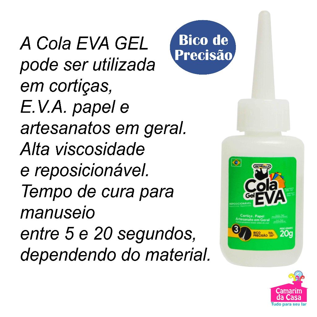 A Cola Gel EVA foi desenvolvida para ser usada em cortiças, EVA, papel e artesanato Cola em gel, não escorre. *Bico de precisão, facilita a aplicação. *Alta Tempo de cura viscosidade. *Tempo de cura entre 5 e 20 segundos dependendo do material. Informações Técnicas: Cola Gel EVA Tubo com: 20g Composição: Etil-2 cianoacrilato líquido. Marca: Rendicolla Validade: Novembro/2026 Observação: as cores disponíveis podem variar de acordo com o modelo do celular ou tela do computador.