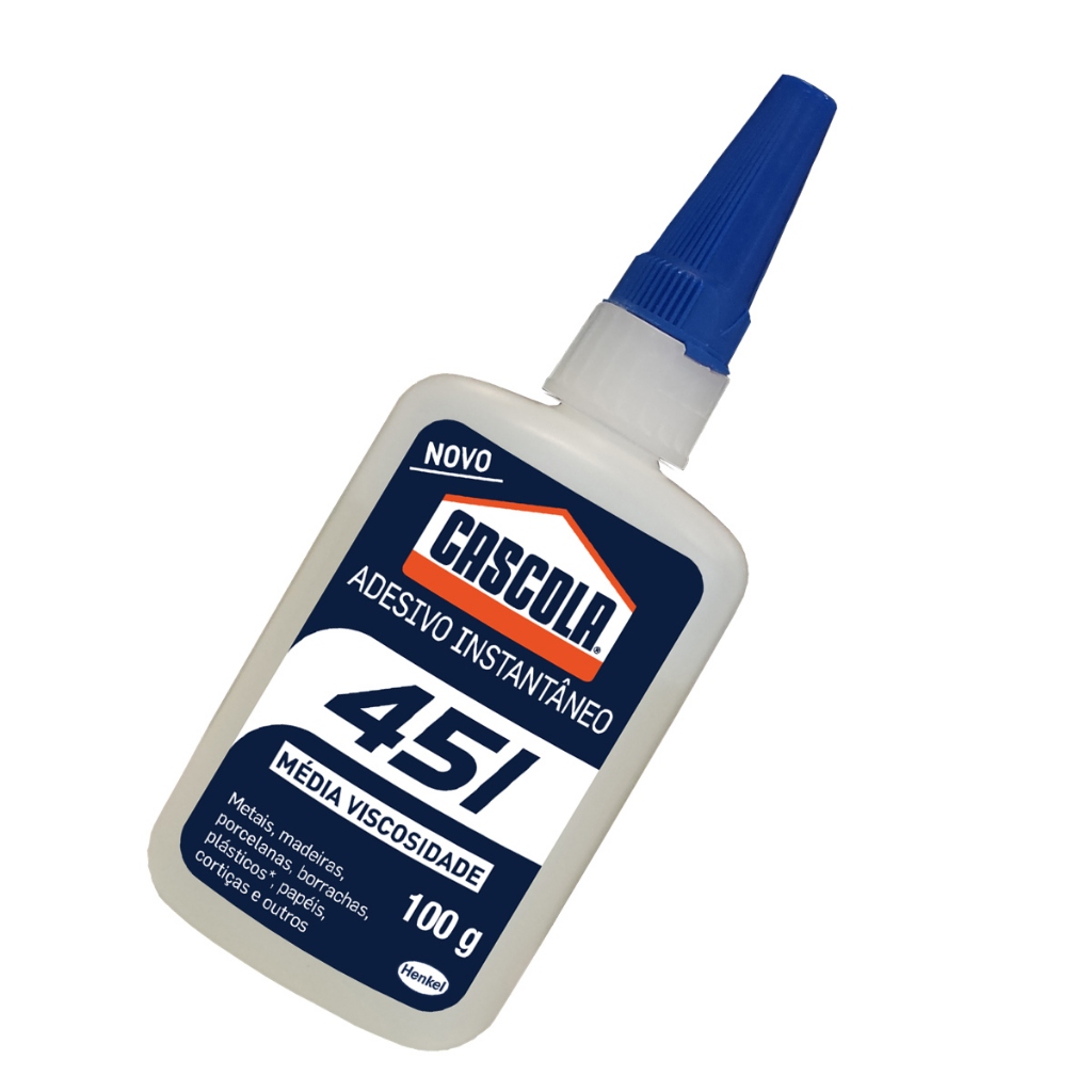 Adesivo Instantâneo 451 - 100 g Descrição: - O Adesivo Instantâneo Cascola 451 é ideal para colagens em metais, madeiras, porcelanas, borrachas, plásticos, papéis, cortiças e outros; - O produto é de fácil aplicação e possibilita excelente acabamento devido a sua transparência e aderência instantânea; - À base de cianoacrilato, o produto cola em poucos segundos, especialmente peças de MDF de diferentes tamanhos, e suporta mais de 30kgf/cm²; - Com tampa exclusiva com sistema prático de abertura e bico antientupimento, o que permite melhor aproveitamento e aplicação do produto. Informações Gerais: - Adesivo instantâneo; - Alta resistência à tração; - Média viscosidade; - Adesão nos mais variados tipos de materiais, inclusive materiais porosos como madeira, MDF, aglomerados e outros; - O produto pode ser utilizado para a colagem de cadeiras, mesas, racks, guarda-roupas, puxador de gaveta (de plástico ou metal), entre outros. Aplicações Sugeridas: - Madeira; - Laminados; - MDF; - Metais; - Porcelana; - Papéis; - Compensado; - Borracha; - Cortiça; - Exceto materiais à base de polietileno (PE), polipropileno (PP), silicone e resina antiaderente (PTFE). Especificações Técnicas: - Cor: Incolor; - Tipo: Líquido; - Conteúdo: 100 g; - Composição: Produto à base de cianoacrilato. Itens Inclusos: - 01 Adesivo instantâneo 451 - 100 g.