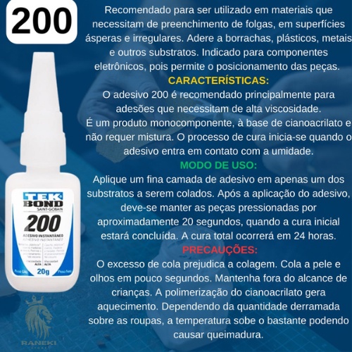1 und - Adesivo Cola Instantâneo 20g 793 - Tek Bond 1 und - Adesivo Cola Instantâneo 20g 725- Tek Bond 1 und - Adesivo Cola Instantâneo 20g 200 - Tek Bond 1 und - Adesivo Cola Instantâneo 20g Couro - Tek BOND 1 UNIDADE COLA MP93 20G 1 UNIDADE DE COLA MP93 100G CARACTERÍSTICAS: Produto que não requer mistura. O processo de cura inicia-se quando uma fina camada de adesivo é aplicada entre as superfícies. Adere diversos tipos de materiais, como compostos de borracha, EPDM, borracha nitrílica, EVA e Viton. É um adesivo multiuso, muito utilizado no setor moveleiro e no setor industrial. Este adesivo é indicado para folgas de até 0,10mm. ATENÇÃO: -O excesso de cola prejudica a colagem; -Cola a pele e olhos em pouco segundos; -Mantenha fora do alcance das crianças; -Dependendo da quantidade derramada sobre as roupas, a temperatura sobe o bastante podendo causar queimadura; - Apesar de ser Usada pela Maior parte das manicures e ser adorada, essa cola NÃO É FEITA PARA UNHAS. MODO DE USO: Para obter um resultado satisfatório, as superfícies devem estar limpas, isentas de óleo e sujeira. Deve-se aplicar uma camada fina de adesivo em apenas 1(um) dos substratos a serem colados, pois o excesso prejudica o bom desempenho da colagem. CARACTERÍSTICAS: O Adesivo Instantâneo adere diversos tipos de materiais, como compostos de borracha, EPDM, borracha nitrílica, neoprene, EVA e Viton. É um adesivo multiuso, muito utilizado no setor moveleiro e no setor industrial. É um produto monocomponente e não requer mistura. O processo de cura inicia-se quando uma fina camada de adesivo é aplicada entre as superfícies entrando em contato com a umidade do ar atmosférico. O Adesivo Instantâneo para Couro é um produto monocomponente e não requer mistura. Ideal para a colagem de couro natural, sintético, emborrachados e afins Qualquer dúvida estamos a disposição no Chat Muito obrigado pela preferência!! Temos o produto à pronta entrega. Efetuamos os nossos envios em até 24hs (exceto finais de semana e feriados), após confirmar o pagamento. ELÉTRICA MC