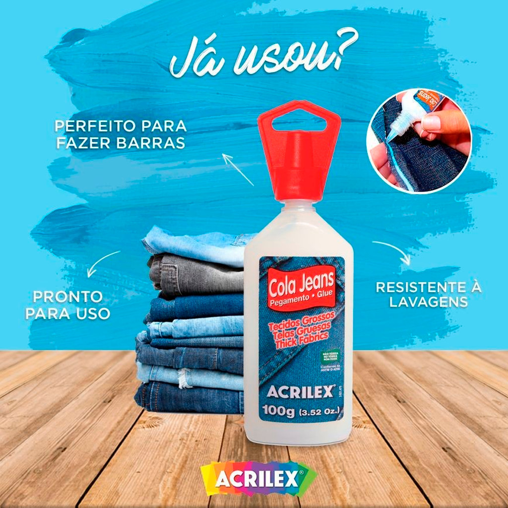 COMERCIAL VIPASA DISTRIBUIDORA. Cola Para Calças Roupas Jeans Profissional Geral De 20g Ou 100g Resistente A Lavagens Alta Fixação Cola para Jeans Acrilex – Incolor – 20g ou 100g – Resistência e Fixação Duradoura Descrição Completa e Detalhada: A Cola para Jeans Acrilex foi desenvolvida especialmente para fixação de tecidos grossos, como jeans e brim, sem a necessidade de costura. De alta resistência e flexibilidade, essa cola é ideal para customizações, reparos e artesanato, proporcionando um acabamento profissional e duradouro. Sua fórmula transparente após a secagem mantém a estética do tecido sem alterar a cor original. Além disso, oferece excelente aderência e resistência à lavagem, garantindo que suas criações permaneçam intactas por muito mais tempo. Disponível nas seguintes variações: 🔹 Cola para Jeans Acrilex 20g – Cód. 🔹 Cola para Jeans Acrilex 100g – Cód. Diferenciais do Produto: ✅ Adere perfeitamente a tecidos pesados como jeans e brim ✅ Dispensa o uso de costura em customizações e reparos ✅ Transparente após a secagem – não altera a cor do tecido ✅ Resistente à lavagem, mantendo a fixação por muito mais tempo ✅ Fácil aplicação e secagem rápida Modo de Uso: 1️⃣ Aplique a cola diretamente no tecido limpo e seco. 2️⃣ Pressione firmemente as partes a serem coladas. 3️⃣ Aguarde a secagem completa antes de lavar ou utilizar. 4️⃣ Para um acabamento mais duradouro, passe o ferro morno sobre o local colado após a secagem. Especificações Técnicas: Marca: Acrilex Cor: Incolor Indicação: Fixação de jeans, brim e tecidos grossos Resistência: Resistente à lavagem após a secagem completa Disponibilidade: 🔸 Cola Jeans Acrilex 20g 🔸 Cola Jeans Acrilex 100g Dimensões e Peso: Cola Jeans Acrilex 20g: Altura: Aproximadamente 10 cm Largura: 3 cm Profundidade: 3 cm Peso: 20g Cola Jeans Acrilex 100g: Altura: Aproximadamente 15 cm Largura: 5 cm Profundidade: 5 cm Peso: 100g cola jeans, cola para tecido, cola acrilex, cola para brim, adesivo para jeans, cola forte para tecido, cola para customização, cola resistente à lavagem, cola para artesanato, reparo de roupas sem costura, cola jeans incolor, fixação de tecido sem costura. COMERCIAL VIPASA DISTRIBUIDORA.