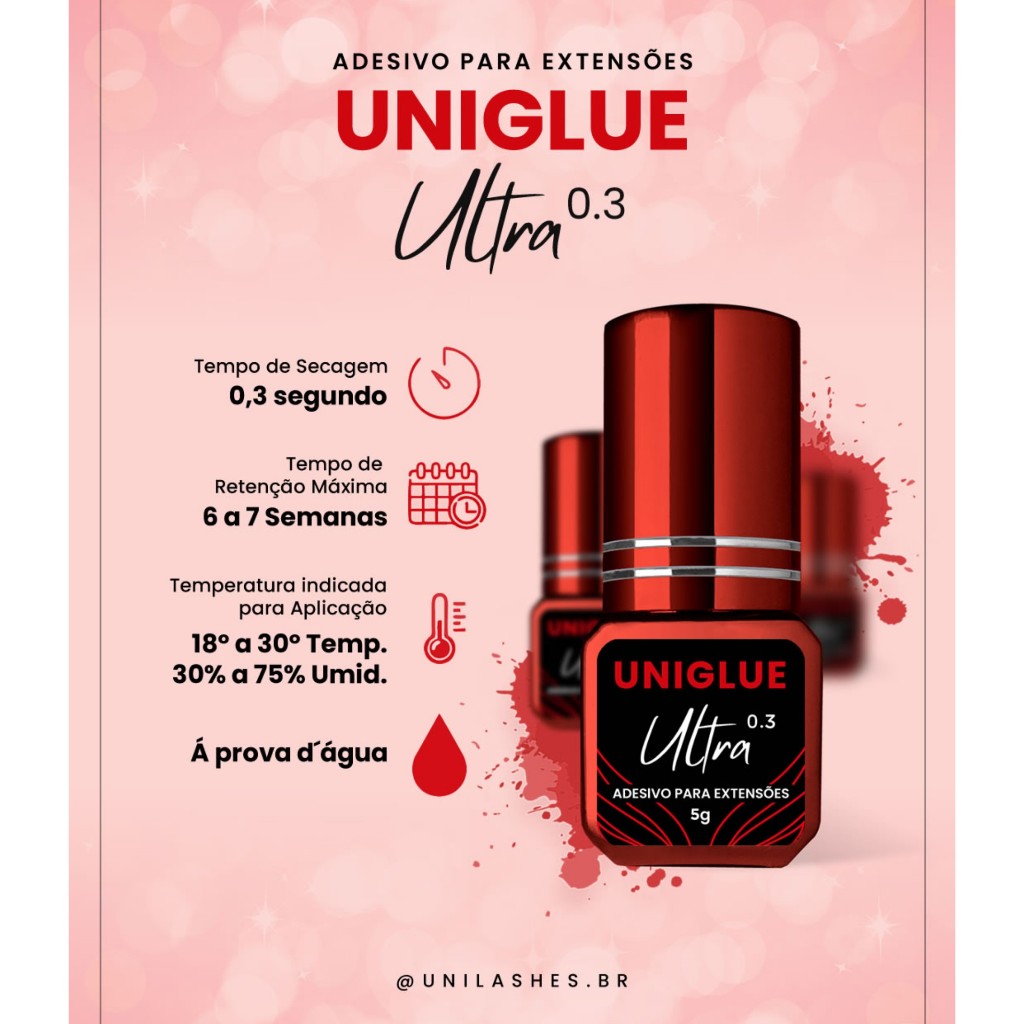 Com esse adesivo você pode molhar as extensões de cílios logo após o procedimento dispensa uso de finalisadores. O segredo para uma aplicação perfeita de extensão de cílios é usar um adesivo de qualidade e o nosso Uniglue Ultra 0.3 é a escolha ideal! Com secagem rápida de 0.3 segundos, você pode trabalhar com mais agilidade e precisão, garantindo resultados incríveis para suas clientes. Uniglue é um adesivo a prova dágua e a prova de óleo. Vai te trazer a durabilidade e a retenção que você tanto sonha em seus procedimentos de extensão de cílios. Experimente agora o adesivo da Unilashes e se surpreenda com a durabilidade e praticidade que ele oferece. Processo Anvisa nº: 25351.403050/2024-71 Composição: Ethyl2 Cyanoacrylate/Cianoacrilato de Etila, Polymethyl Methacrylate/ Metacrilato De Polimetila, Sodium Stearate/Estearato de Sódio, Carbon Black/ Corante Preto 77266. Nível de habilidade: EXPERT Cor: Preta Nível ardência: Baixo Secagem: 0.3 segundos Duração: 6 a 8 semanas Umidade ideal para uso: 30 -75% Temperatura ambiente ideal: 18 a 30ºC Marca: UNILASHES Produto indicado somente para profissionais. **NÃO** INDICADO PARA USAR COM CÍLIOS POSTIÇOS E TUFINHOS