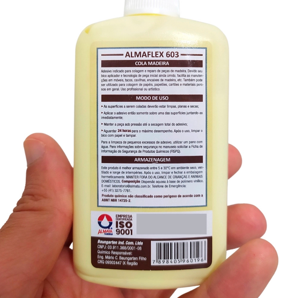 COMERCIAL VIPASA DISTRIBUIDORA. Cola Para Madeira Profissional Para Móveis Em Geral Artesanato 90g MDF Compensado Alta Fixação A ALMAFLEX® Cola para Madeira é uma ótima opção para colagem e reparos em peças de madeira. Ela apresenta um alto grau de aderência, o que significa que a cola se une fortemente às superfícies de madeira, proporcionando uma união forte e durável. Além disso, ela é caracterizada por uma elevada resistência, o que a torna adequada para aplicações onde é necessário suportar cargas e tensões. Pode ser utilizada em uma ampla variedade de aplicações, como por exemplo, na montagem de móveis, reparo de objetos de madeira, ou na fabricação de estruturas de madeira. Ela é uma escolha popular entre carpinteiros, marceneiros e fabricantes de móveis devido à sua qualidade e desempenho. Benefícios - Pega rápida; - Resistente ao impacto; - Maior preenchimento; - Bico aplicador, que proporciona um reparo rápido. Indicação Indicado para colagens de tábuas, laminados, painéis, escadas, portas, janelas, madeira de média e baixa densidade, MDF, MDP, compensados e aglomerados. Modo de uso 1- As superfícies a serem coladas deverão estar limpas, planas e secas; 2- Aplique o adesivo então somente sobre uma das superfícies juntando-as imediatamente (utilizar o bico aplicador, pincel, rolo etc. que preencha toda superfície); 3- Mantenha a peça sobre pressão até a secagem total do adesivo (aprox. 4 horas); Observação: A pressão aplicada deve ser em função do tipo de madeira. Não ultrapassar 5 minutos o tempo em aberto para montagem; 4- Para o máximo desempenho aguarde 24 horas. Rendimento 150 a 200g/m². Composição Dispersão aquosa à base de polímero vinílico. COMERCIAL VIPASA DISTRIBUIDORA.