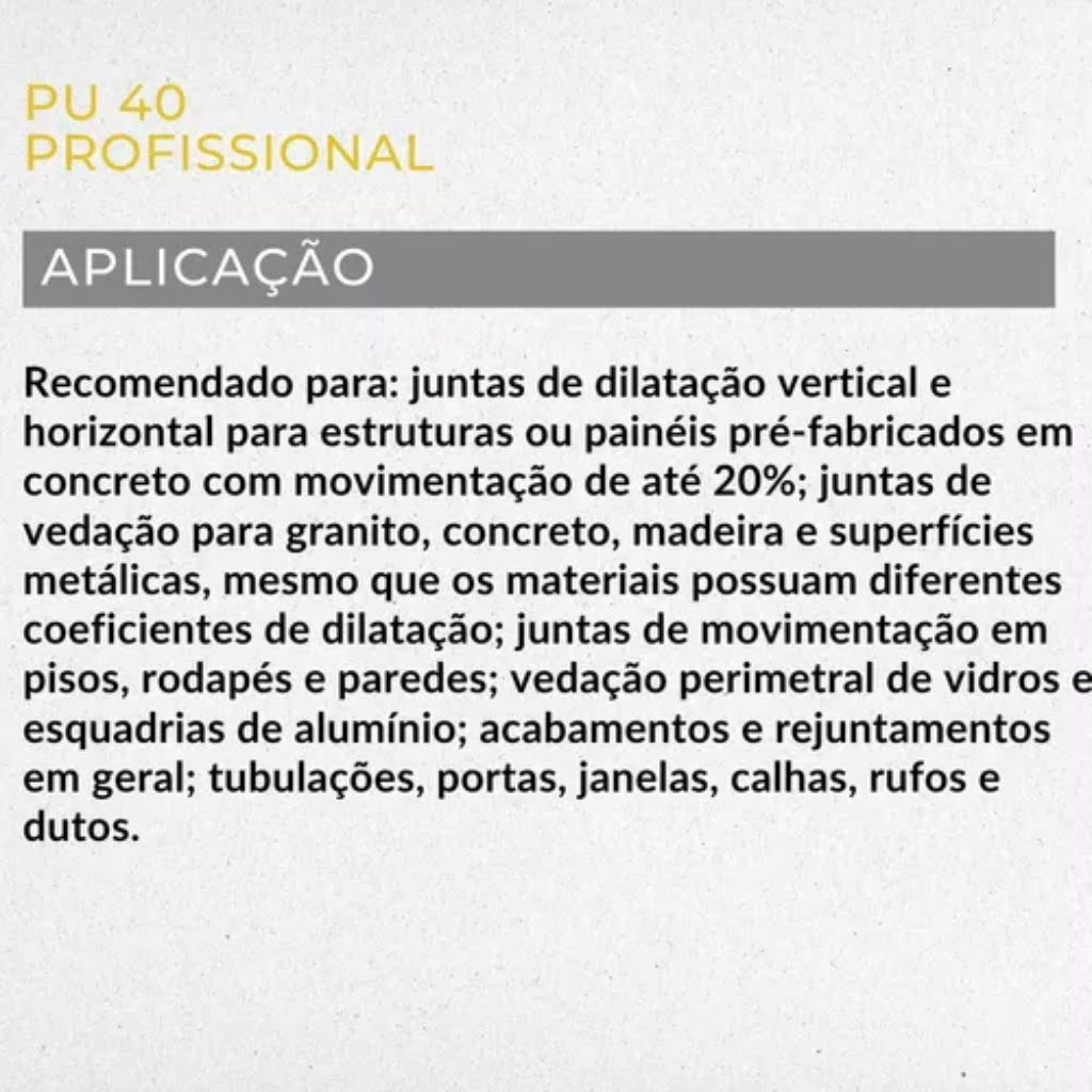 PU 40 - Bisnaga de 80gr com bico aplicador - Não precisa da ferramenta aplicador de silicone. -----Selecione a cor desejada disponível------ PU 40 é um selante monocomponente a base de Poliuretano híbrido de alta performance, especialmente desenvolvido para as diversas aplicações existentes na Construção Civil, como serviços estruturais, juntas de dilatação de fachadas, pisos internos ou externos, esquadrias ou estruturas de concreto. Também indicado para linha automotiva, náutica e industrial. PU 40 é um produto estável e, após completa vulcanização, resulta em uma borracha elástica com perfeita adesão coesiva aos substratos, sem necessidade do uso de primer e podendo ser aplicado também em superfícies úmidas. Alta resistência ao choque térmico e elevada resistência às intempéries (agentes climáticos, UV e ozônio). Possui baixo VOC, é isento de solventes e isocianatos, odor neutro, fácil aplicação, alta durabilidade e resistência química, não escorre quando aplicado na vertical, não exsuda óleo que causa mancha, não corrosivo para superfícies metálicas e espelhos, aceita pintura. PU 40 é recomendado para as seguintes aplicações: juntas de dilatação vertical e horizontal para estruturas ou painéis pré-fabricados em concreto com movimentação de até 20%; juntas de vedação para granito, concreto, madeira e superfícies metálicas, mesmo que os materiais possuam diferentes coeficientes de dilatação; juntas de movimentação em pisos, rodapés e paredes; vedação perimetral de vidros e esquadrias de alumínio; acabamentos e rejuntamentos em geral; tubulações, portas, janelas, calhas, rufos e dutos.