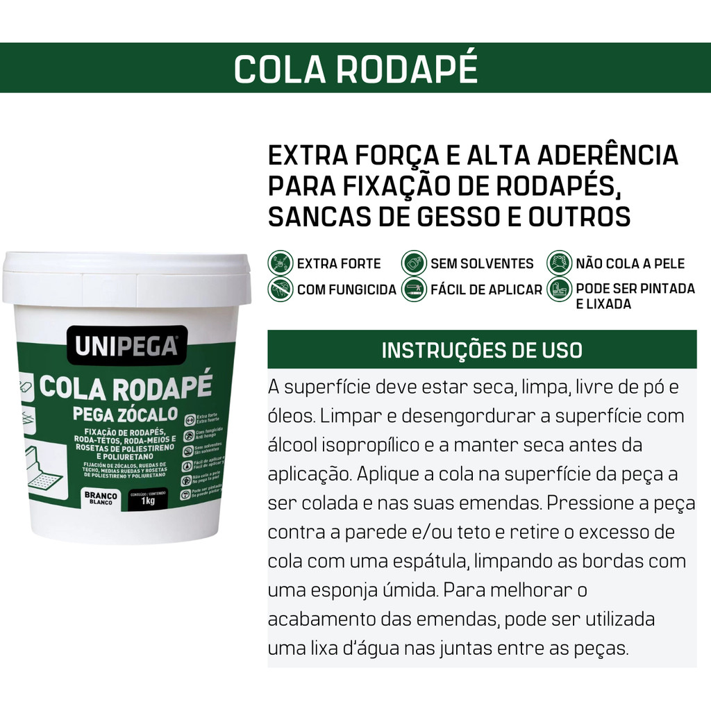 COLA RODAPÉ Contém 1 (uma) unidade DESCRIÇÃO A Cola Rodapé da Unipega é a solução ideal para dar um toque especial à sua casa. Uma cola à base de resina acrílica sem solventes para fixação de rodapés, roda-meios, roda-tetos e rosetas. Adere em diversos materiais, como plástico, madeira, azulejo, tijolo, gesso, papelão e MDF. Possui alta aderência, que garante uma fixação firme e durável. Ela é fácil de aplicar e de remover excessos, sem colar a pele. Pode ser pintada e lixada após cura total, permitindo um acabamento perfeito. A Cola Rodapé da Unipega é resistente à umidade e formação de fungos, garantindo a segurança e higiene do ambiente. ESPECIFICAÇÕES - Contém 588mL / 1kg - Extra forte - Sem solventes - Não cola a pele - Com fungicida - Fácil de aplicar e limpar - Pode ser pintada e lixada APLICAÇÃO A superfície deve estar seca, limpa, livre de pó e óleos. Remover todos os resíduos de materiais, especialmente os que não estão aderidos suficientemente às camadas (lixar, se necessário). Limpar e desengordurar a superfície com álcool isopropílico e a manter seca antes da aplicação. Não utilizar querosene ou gasolina para a limpeza das superfícies. Para melhor acabamento recomenda-se utilizar fita adesiva nas áreas laterais da junta onde não se pretende o contato do produto. No caso de aplicações em substratos diferentes dos mencionados, recomenda-se realizar um teste para avaliar a adesão e compatibilidade do produto. Aplique a cola na superfície da peça a ser colada e nas suas emendas. Pressione a peça contra a parede e/ou teto e retire o excesso de cola com uma espátula, limpando as bordas com uma esponja úmida. Para melhorar o acabamento das emendas, pode ser utilizada uma lixa d’água nas juntas entre as peças. ATENÇÃO Não utilizar em espelhos e aquários. Não aplicar em plásticos à base de polietileno, polipropileno, nylon®, acrílico e politetrafluoretileno. Não utilizar em peças que terão contato com alimentos e imersão contínua em meios líquidos. Não utilizar em fachadas de vidro e qualquer adesão estrutural que necessite resistência. Não utilizar em superfícies que eliminam óleo, plastificantes ou solventes, como madeira imersa em óleo, superfícies quando estão molhadas, paredes com revestimento em processo de descascamento. Antes de pintar, recomenda-se efetuar um pré-teste. Tintas à base de solventes e óleos podem ser prejudiciais ao produto.