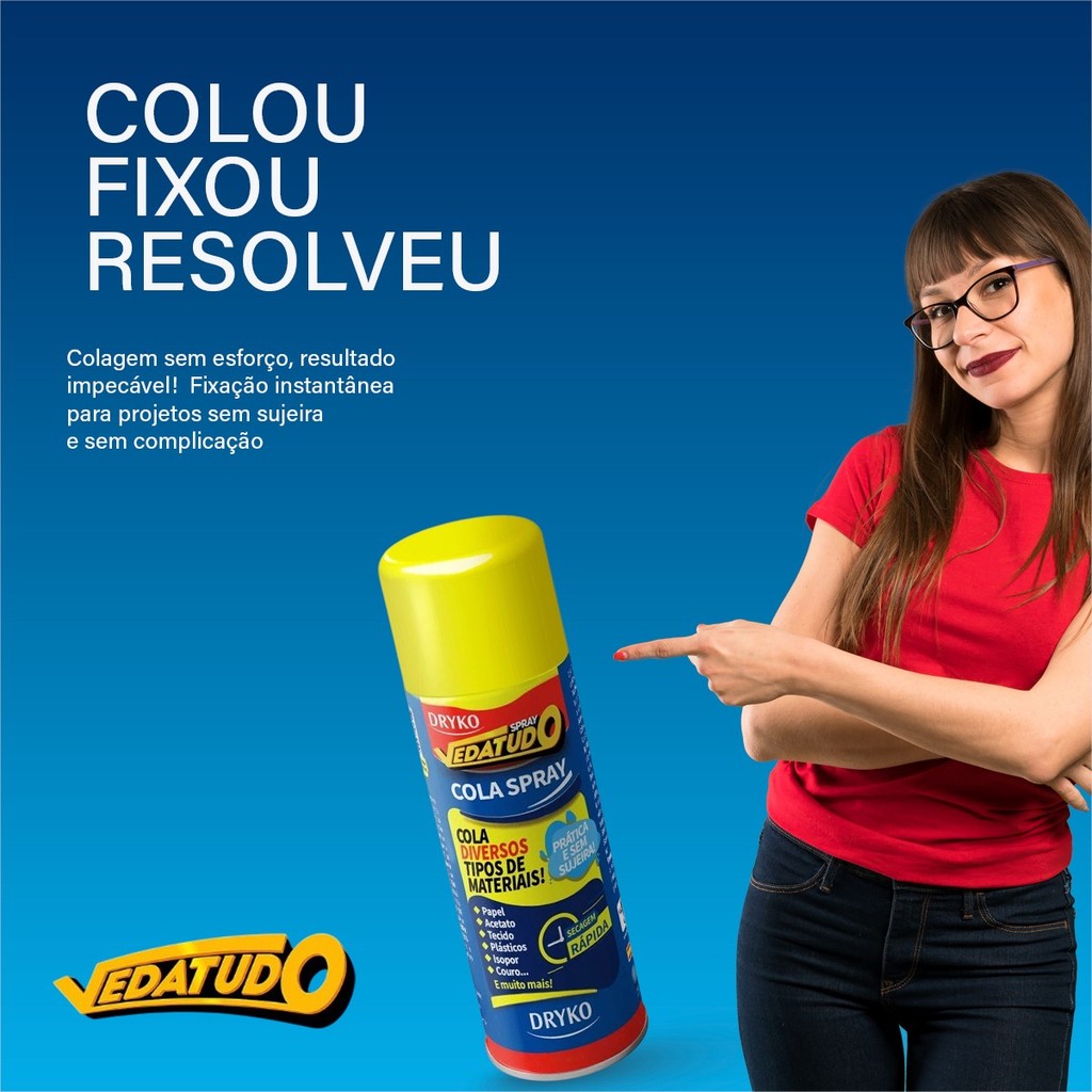 COLA SPRAY VEDATUDO Cola spray permanente Cola Spray Vedatudo é um adesivo a base de elastômero sintético de fixação permanente, indicado para uso em geral de peças leves com rápida e fácil aplicação e sem desperdício. Onde aplicar • Papel de parede, papel em geral e papelão • Acetato e alguns plásticos • Feltro e Tecidos • Cortiça, Couro e Carpete • Espumas, Isopor e Madeira. Vantagens • Fácil aplicação • Não escorre • Não enruga a superfície • Alto poder de cobertura e rendimento • Adere em diversos tipos de materiais • Secagem e cola rápida • Jato uniforme sem desperdício. Tempo de secagem 1 a 30 Min Aplicação do produto: Agite bem a lata da COLA SPRAY VEDATUDO antes de aplicar. Segure a lata em posição vertical, aperte totalmente a válvula e aplique a uma distância de 15 – 20 cm da superfície. Deixe agir por no mínimo um minuto e junte as peças a serem coladas, mantendo pressão até a colagem inicial. Para evitar entupimentos, após a utilização, inverta a lata e pressione válvula até sair somente o gás. Isto evitará o entupimento da válvula. Cor: Transparente Rendimento: Até 3m²/400 ml Varia conforme tipo de colagem.