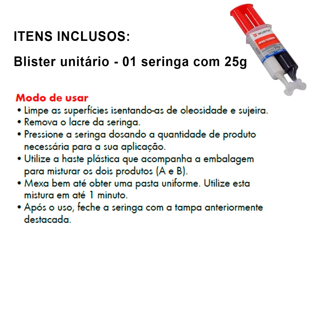 MAIS FORTE QUE O SUPER BONDER !!! EPOXI TITANIO COLA ATÉ TIJOLO, PLASTICO, METAL, TAPA FURO CANO !! PODE SER USINADO ! Epoxi Titânio Wurth Cola epóxi Adesivo epóxi Wurth Epoxi para metal Descrição do produto Adesivo epóxi bi-componente à base de titânio para colagem e reparações de superfícies metálicas diversas, especialmente o aço, plásticos, madeira, pedra, azulejo, etc. ITENS INCLUSOS: Blister unitário - 01 seringa com 25g Características • Excelente adesão em diversos metais. • Cura parcial em 10 minutos. • Aplicação prática e rápida. • Seringa aplicadora, facilita o manuseio e mistura dos componentes. • Para colagens de superfícies lisas, porosas e até mesmo irregulares. • Uso profissional e doméstico. • Após curado aceita usinagem. Informações Dados Aspecto Líquido, Resina e Endurecedor Aspecto após curado Cinza Odor Resina: solvente leve Densidade 1,10 ± 0,05 Viscosidade 17 ± 2,0 Pas.s Temperatura de aplicação De +5º.C à + 45º.C Proporção de mistura 1 parte de resina e 1 parte de endurecedor Resistência à temperatura após curado De -30º.C à + 85º.C Cura Inicial 10 +/- 1 minuto Cura Total 24 horas Dureza Shore D 92 ± 5 Resistência ao cisalhamento, em aço carbono 122 kgf/cm2 Temperatura de trabalho Até 70ºC Aplicações • Reparação: carcaças de bombas, roletes, hélices, trocadores de calor, tubulações metálicas de sistemas hidráulicos, roscas espanadas em conexões e válvulas, instalações de calefação, condicionador de ar, etc. • Manutenção: radiadores, tanques, recipientes e condutores de água e óleo, carcaças de bomba d’água e óleo. • Preenchimento: falhas e desgastes em peças fundidas e usinadas, eixos, cilindros hidráulicos, blocos de motores, alojamentos de rolamentos, cárter de motores, etc. • Fabricação: moldes, modelos, guias, protótipos, etc. • Colagem de metais, plásticos, madeira, pedra, azulejo, Modo de usar • Limpe as superfícies isentando-as de oleosidade e sujeira. • Remova o lacre da seringa. • Pressione a seringa dosando a quantidade de produto necessária para a sua aplicação. • Utilize a haste plástica que acompanha a embalagem para misturar os dois produtos (A e B). • Mexa bem até obter uma pasta uniforme. Utilize esta mistura em até 1 minuto. • Após o uso, feche a seringa com a tampa anteriormente destacada. PRODUTO ORIGINAL COM NOTA FISCAL, ENVIO NO MESMO DIA OU NO PRÓXIMO DIA ÚTIL.