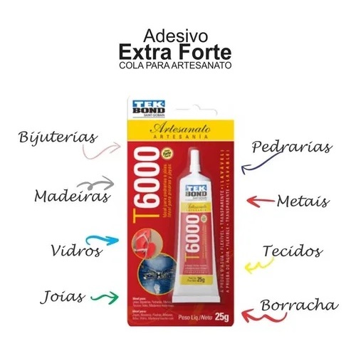 ❤️Cola Adesivo para Artesanato Tek Bond T6000 → 110 gramas ou 60 gramas A Cola Permanente T6000 é indicada para trabalhos artísticos, especialmente na criação de bijouterias e colagem de pedrarias em geral. Ideal também para vários tipos de materiais como: madeira, papel, papelão, tecidos, metal, vidro, fibra de vidro, cerâmica, alvenaria e concreto. Adere fortemente também ao couro, borracha, vinil, chinelos, capa para celulares entre outros materiais. Depois de seco mantém-se transparente e flexível Fabricante: TekBond 😍