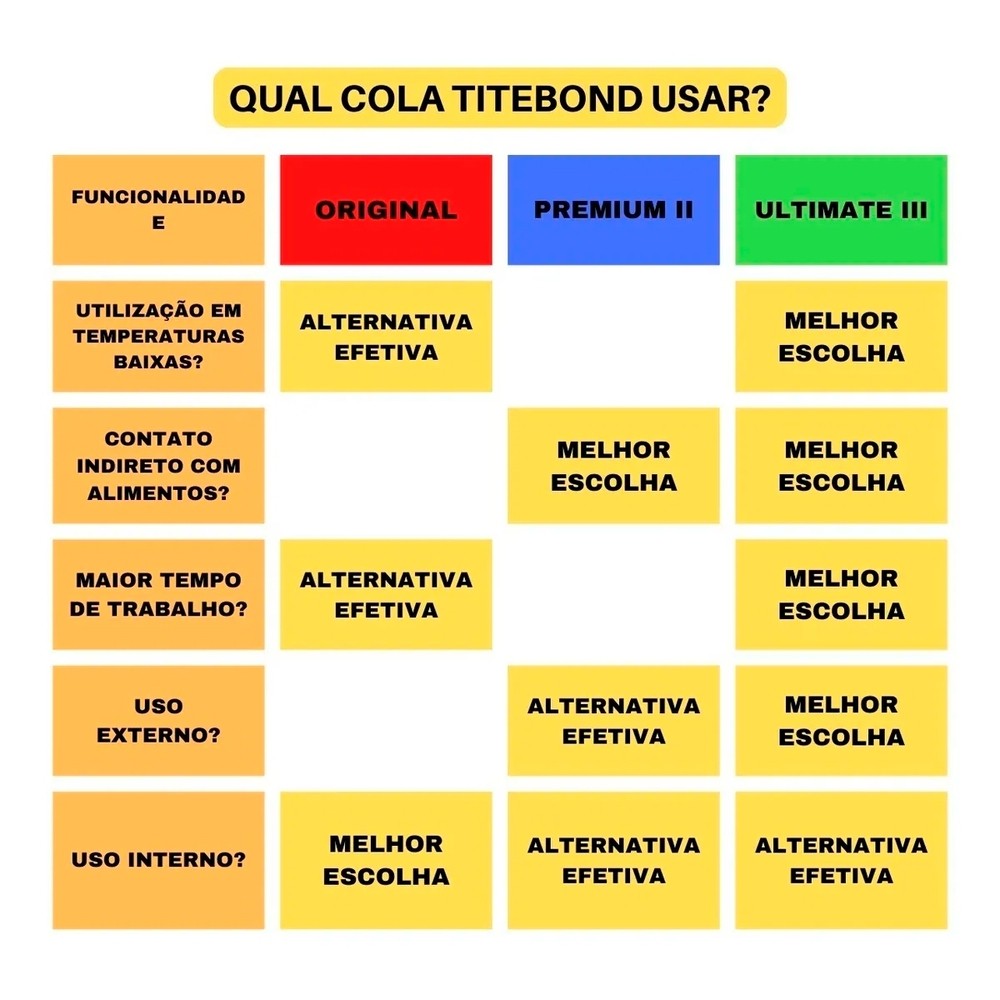 A Titebond é uma empresa estadunidense que produz colas, adesivos e selantes para madeira e construção. Por trás de produto da Titebond estão mais de oito décadas de excelência, desenvolvimentos tecnológicos, e dedicação. Exemplo da qualidade de seus produtos, são as colas da linha Premium que foram desenvolvidas pela a marca e que se tornaram populares no mercado por ser considerada a primeira cola para madeira à base d'água. O que há torna uma escolha perfeita para a construção de casas de passarinhos, móveis de jardins, decks, pergolados e utensílios de cozinha como tábuas de corte. Já que além de ser resistente a água e maresia, a mesma foi aprovada pela FDA para o contato indireto com alimentos. Especificações: • Marca: Titebond; • Modelo: Titanium; • Temperatura de aplicação: Acima de 8°C; • Tempo de montagem em aberto: 10 minutos (máx) (em temperatura de 21°C, 50% de umid. Relativa); • Tempo de montagem total: 20-25 minutos (em temperatura de 21°C, 50% de umid. Relativa); • Quantidade mínima de adesivo: Aproximadamente 6 mils ou 170 g/m²; • Resistência: 4,000 PSI. • Tempo em aberto: 8-10 minutos. • Temperatura mínima de aplicação: 8,3°C. • Viscosidade: 4,200cps. • Pressão requerida: O suficiente para que haja perfeito contato entre as peças (geralmente 100-150 psi para madeiras macias; 125-175 psi para madeiras de média densidade e 175-250 psi para madeiras duras); • Métodos de aplicação: Com o bico do próprio frasco; com rolo ou pincel;• Limpeza: Pano úmido, enquanto o adesivo ainda estiver úmido. Excesso de adesivo já seco deve ser removido raspando-o; • Peso Líquido: 132g. • Limpeza com água. • Não tóxico. • Aprovado pela FDA para contato indireto com alimentos. • Cola à prova d'água. • Cor do filme da cola original depois de seco: Marrom claro.