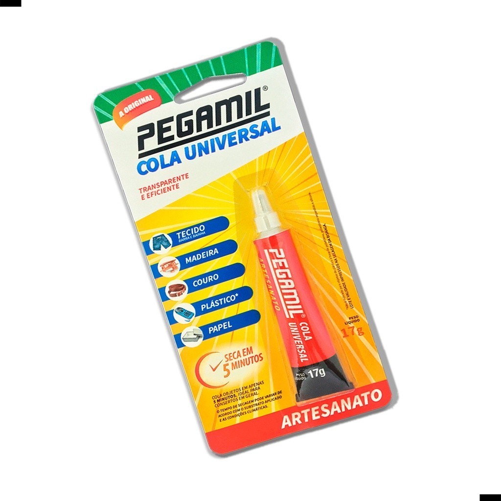 Cola Universal Pegamil 17g. Perfeita para artesanato em geral, pois a colagem é rápida, atóxica e não deixa resíduo ou manchas no material que foi colado. Desenvolvido especialmente para uso em trabalhos manuais, hobbies, artesanato e pequenos reparos. É transparente e fácil de limpar. Não contém tolueno. Indicado para papel cartão, passamanaria, renda, tecido, cortiça, madeira, couro, acrílico, PVC, plásticos e etc.Quantidade: 1 Unidade.Embalagem: 17 Gramas.