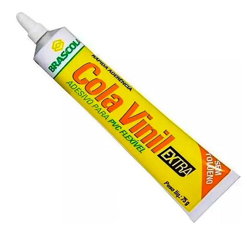 COMERCIAL VIPASA DISTRIBUIDORA. COLA VINIL PVC 75G (3140002) / BRASCOLA . Cola Vinil Adesivo de contato para colagem de PVC flexíveis entre si. Adesivo tradicional a mais de 40anos no mercado, ideal para colagens de PVC’s flexível entre si. Para reparos em infláveis, boia, piscinas, barracas de camping, malas, lonas de capota naútica e outros materiais. Excelente resistência à água e intempéries. Isento de tolueno. Secagem: 24horas. COMERCIAL VIPASA DISTRIBUIDORA.