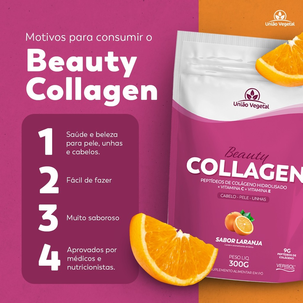 Bem-vindo à Loja Oficial União Vegetal na Shopee! Nós somos a Loja Oficial da Marca, o que nos permite oferecer a vocês produtos com garantia total de originalidade, qualidade superior e preço justo. Há mais de 20 anos no mercado, nosso compromisso é entregar soluções de confiança para melhorar seu bem-estar e estilo de vida. Todos os produtos estão disponíveis à pronta entrega, e se sua compra for confirmada até as 12h30, realizamos o envio no mesmo dia! Aqui, você compra direto da fonte, sem intermediários, garantindo sempre a procedência e excelência do que chega até você. ---------------------------------------------------------------------------------------------------------------------------------------------------------------------------------------------------------- O que você receberá em casa: 1 sachê de Beauty Collagen com 300g Sabor: Laranja Produto à pronta entrega. ---------------------------------------------------------------------------------------------------------------------------------------------------------------------------------------------------------- Beauty Collagen - União Vegetal - Suplemento para Pele, Unhas e Cabelos Quais são os benefícios de utilizar o Beauty Collagen? O Beauty Collagen é especialmente desenvolvido para a manutenção da saúde da pele, unhas e cabelos, contribuindo para a redução de rugas e aumento da elasticidade. Enriquecido com Colágeno Verisol®, Vitaminas C e E, é o aliado ideal para quem busca cuidados de dentro para fora. ---------------------------------------------------------------------------------------------------------------------------------------------------------------------------------------------------------- Benefícios principais: Promove a elasticidade e firmeza da pele. Auxilia na redução de rugas e linhas de expressão. Fortalece as unhas e melhora o volume dos cabelos. Contém ação antioxidante, protegendo contra os danos dos radicais livres. Rico em Vitaminas C e E. Fácil de preparar e com sabor delicioso. ---------------------------------------------------------------------------------------------------------------------------------------------------------------------------------------------------------- Diferenciais: Contém Colágeno Verisol®, clinicamente comprovado. Enriquecido com Vitaminas C e E. Não contém glúten e lactose. Livre de açúcares adicionados. ---------------------------------------------------------------------------------------------------------------------------------------------------------------------------------------------------------- Ingredientes: Colágeno hidrolisado, peptídeos bioativos de colágeno hidrolisado (VERISOL®), vitamina C (ácido ascórbico), vitamina E (tocoferol), antiumectante dióxido de silício, edulcorante sucralose, corante amarelo tartrazina, aromatizante sintético idêntico ao natural de laranja. Não contém glúten e lactose. ---------------------------------------------------------------------------------------------------------------------------------------------------------------------------------------------------------- Sugestão de Uso: Adicione 1 scoop (10g) em 200ml de água ou bebida de sua preferência. Consumir uma vez ao dia ou conforme orientação de um médico ou nutricionista. ---------------------------------------------------------------------------------------------------------------------------------------------------------------------------------------------------------- Advertências: Este produto não deve ser consumido por gestantes, lactantes e crianças. Este produto não é um medicamento. Não exceder a recomendação diária de consumo indicada na embalagem. Produto direcionado a adultos acima de 19 anos. ---------------------------------------------------------------------------------------------------------------------------------------------------------------------------------------------------------- Perguntas Frequentes sobre o Beauty Collagen O Beauty Collagen contém glúten ou lactose? Não, ele é totalmente livre de glúten e lactose. Quem pode consumir o Beauty Collagen? É indicado para adultos acima de 19 anos que desejam melhorar a saúde da pele, unhas e cabelos. O produto possui sabor? Sim, o Beauty Collagen está disponível no sabor Laranja. Em quanto tempo posso ver os resultados? Os resultados podem variar, mas geralmente são percebidos em algumas semanas de uso regular. Quantas porções contém o sachê de 300g? O sachê contém 30 porções de 10g cada, o que equivale a um mês de uso. O produto é adequado para veganos? Não, pois contém colágeno, que é de origem animal. Posso misturar o Beauty Collagen com outras bebidas? Sim, ele pode ser misturado com sucos, shakes, ou até mesmo no café da manhã. O Beauty Collagen ajuda a reduzir celulite? O colágeno pode ajudar a melhorar a elasticidade da pele, contribuindo para a redução do aspecto da celulite quando aliado a uma dieta equilibrada e exercícios.