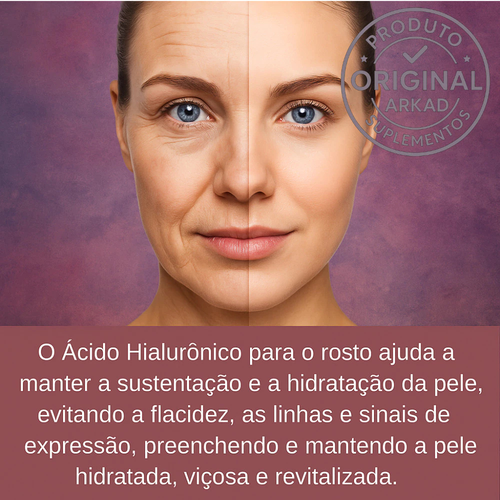 Colágeno Hidrolisado Com Ácido Hialurônico + Biotina - Arkad Suplementos - Original PRODUTO ORGINAL - COM CNPJ ATIVO - LABORATÓRIO REGISTRADO NA ANVISA A principal função do colágeno hidrolisado é proporcionar firmeza e elasticidade, além de combater a flacidez e o envelhecimento da pele. Esse suplemento também contribui para o fortalecimento dos cabelos e unhas. A Biotina é uma vitamina do complexo B (B7) muito importante para a saúde de diversas estruturas do seu corpo, e isso inclui as suas unhas. A deficiência desse nutriente é um dos fatores associados à síndrome das unhas frágeis. O seu consumo, em alguns casos, pode ser a solução para o problema. O Ácido Hialurônico é um ativo produzido naturalmente pelo corpo que possui propriedades hidratantes e estimulantes de colágeno. É encontrado no organismo, mas com o passar do tempo sua produção diminui, precisando ser reposto. NÃO ACEITE IMITAÇÕES, CONSULTE O CNPJ DO PRODUTO SUGESTÃO DE USO: Ingerir 2 cápsulas ao dia.