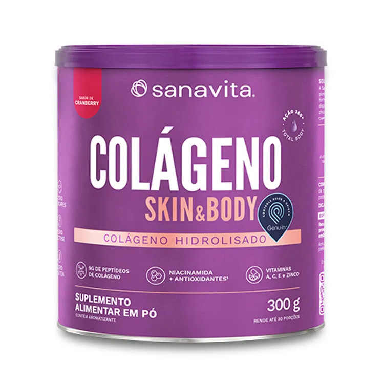 COLAGENO SKIN - CRAMBRERRY - LATA 300G O Colágeno Skin da Sanavita combina 9g de peptídeos ativos de colágeno de alta absorção a um complexo antioxidante que atende 100% das necessidades diárias de vitaminas A, C, E e o mineral zinco, todos com ação antioxidante. Sua fórmula precursora de colágeno é uma grande aliada da saúde e beleza da pele, nutrindo e mantendo-a protegida dos danos causados pela ação dos radicais livres. A vitamina C auxilia na formação do colágeno e juntamente com a vitamina E e o zinco são importantes antioxidantes. A vitamina A contribui para a manutenção da pele, e o zinco, além da pele, contribui para a manutenção do cabelo e das unhas. A Sanavita é referência em colágeno no Brasil e sua fórmula é pioneira no mercado, aprovada em estudo clínico com apenas 3 meses de uso.