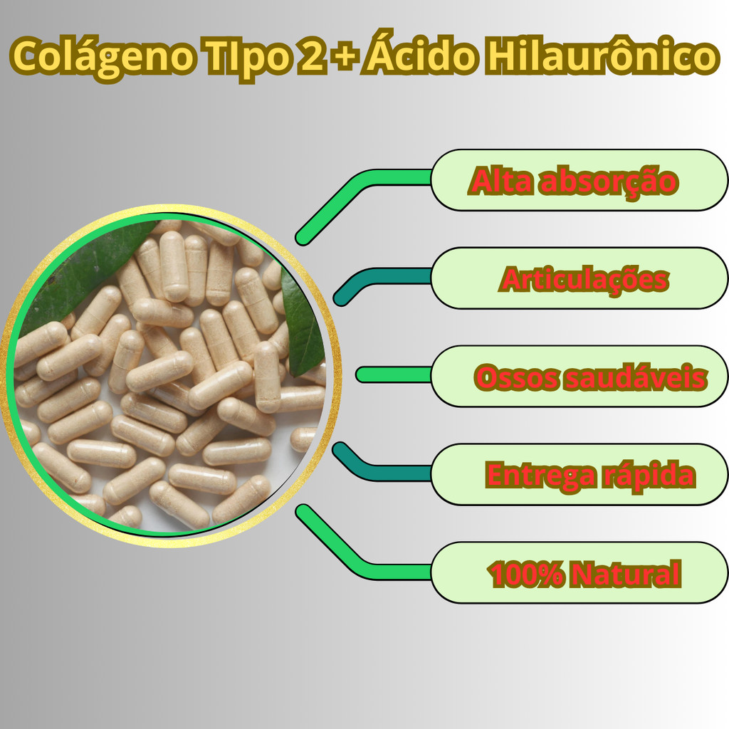 Colágeno Tipo 2 + Ácido Hialurônico 120 Cáps 500 mg, suplemento para articulações e ossos