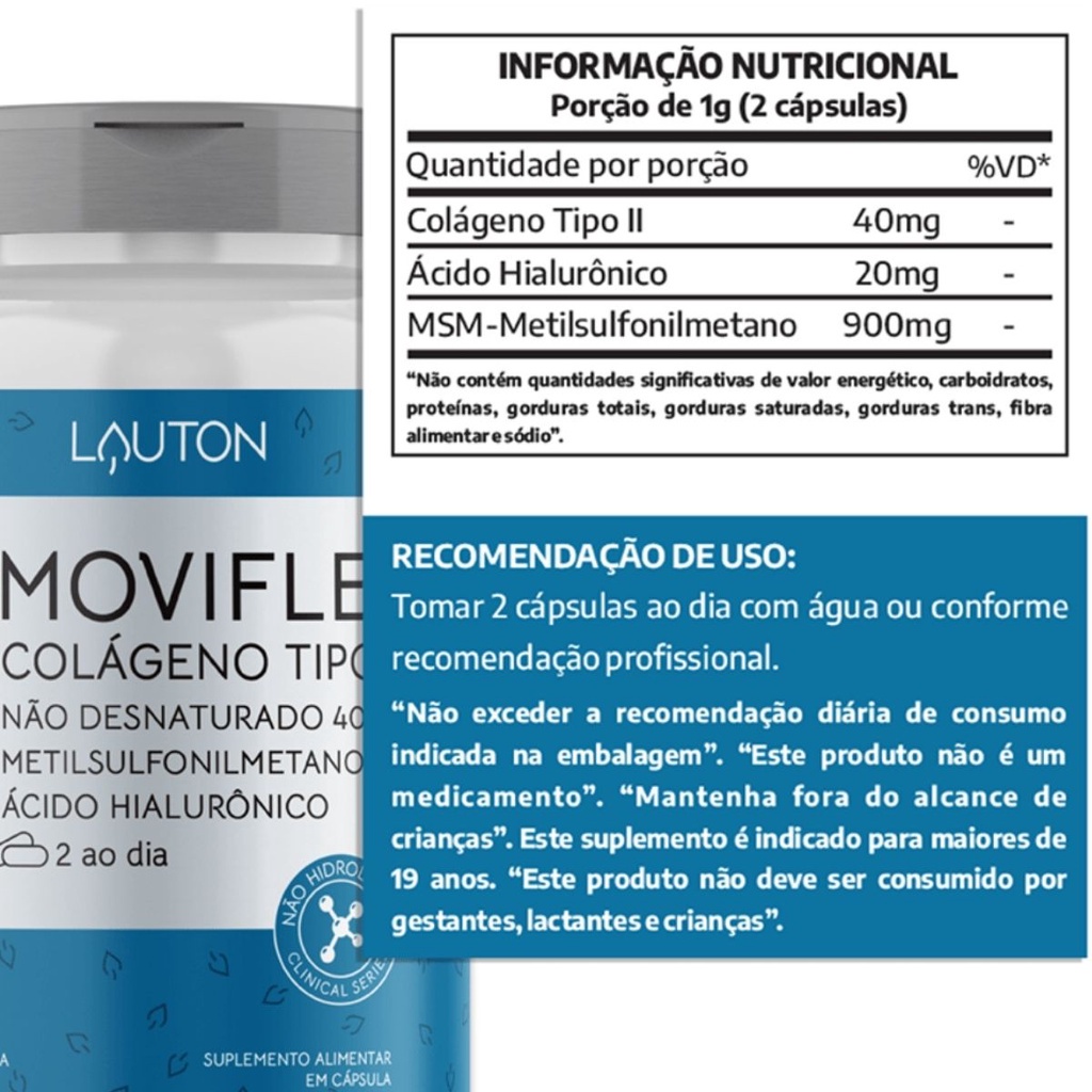 Moviflex Colageno Tipo 2 Nao Hidrolisado com Ácido Hialurônico + Enxofre Orgânico MSM - Lauton Nutrition Clinical Series Kit com 2 potes Colágeno Tipo II 40mg - 900mg MSM por cápsula - 20mg Ácido Hialurônico O Colágeno Tipo II + MSM Lauton é um suplemento alimentar em cápsulas aliado a saúde das articulações e cartilagens. O Colágeno não Desnaturado tipo II age juntamente com o sistema imunológico para manter as articulações saudáveis e promover a mobilidade e flexibilidade das articulações. Já o MSM é uma forma natural de enxofre orgânico encontrada no organismo e é responsável por manter a elasticidade e flexibilidade do tecido conectivo e cartilagens das articulações. Juntos eles contribuem para a diminuição da degradação das articulações, bem como auxiliam nos quadros de inflamação e perda de lubrificação das articulações. Para que serve: • Alta concentração de Colágeno Tipo II e MSM por cápsula • Aliado da saúde dos ossos e articulações • Ajuda a prevenir lesões nas articulações • Auxilia na reposição do colágeno • Favorece a reconstrução das cartilagens • Proporciona mais força muscular • Promove maior conforto das articulações inflamadas =================================================== - Tomar 2 cápsulas ao dia com água ou conforme recomendação profissional. - Produto dispensado da obrigatoriedade de registro conforme RDC 27/10 e 240/18 ANVISA - Pote com 60 cápsulas - Você receberá 2 potes 23/04/2023 17:30:45