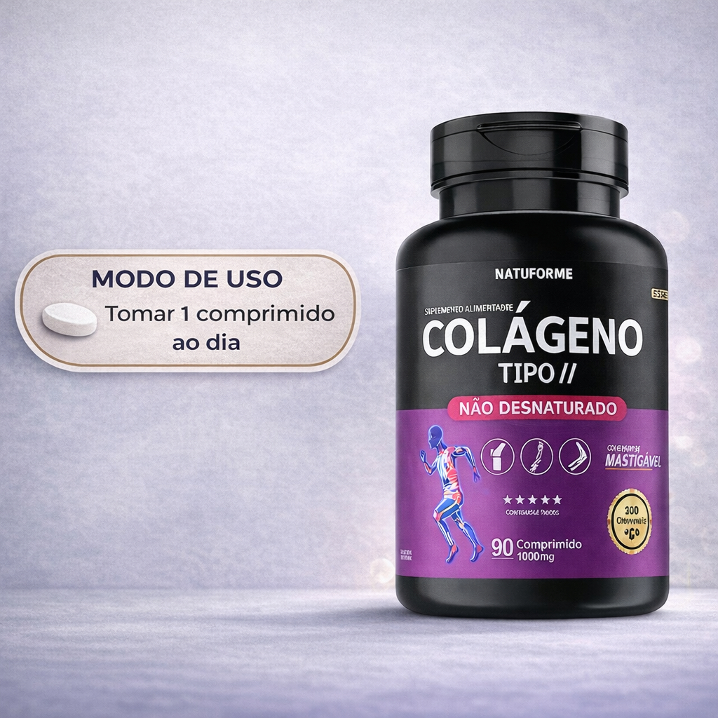 ATENÇÃO: ESTE PRODUTO OFERECE SUPORTE AO TRATAMENTO, TRATANDO-SE APENAS DE UM PRODUTO COMPLEMENTAR E NÃO DEVE SER CONSIDERADO UM REMÉDIO! > SEJA BEM-VINDO E BEM-VINDA < Será um imenso prazer tê-la (o) como cliente! POSTAMOS RAPIDAMENTE AS ENCOMENDAS TODOS OS DIAS ÚTEIS. ============================================ DESCRIÇÃO DO PRODUTO: COLÁGENO TIPO II NÃO DESNATURADO mastigável, sabor MORANGO / IOGURTE. Pote com 90 comprimidos de 1.000 mg ============================================ Modo de uso Mastigar 1 comprimido 1x ao dia. ========================================== O colágeno é a maior proteína em nosso corpo humano, sendo o componente principal para estrutura dos tecidos conjuntivos, incluindo tendões, ligamentos, pele e músculo, além de auxiliar no fortalecimento dos ossos. Com o tempo, o colágeno começou a se tornar cada vez mais popular, sendo a maioria hidrolisada, o que significa que o colágeno está fragmentado, facilitando ainda mais a absorção. Dentro do produto, além do colágeno do tipo 2, participa diretamente da melhora da hidratação articular e elasticidade dos tecidos. Além disso, a fórmula também conta com vitaminas e minerais, fazendo ainda mais sinergia com os demais ingredientes. Esse colágeno além de ter um sabor único é totalmente SEM AÇUCAR e SEM GLÚTEN. O composto consegue ser 100% absorvido pelo corpo, assegurando a absorção do máximo de ativos. INGREDIENTES: Colágeno Tipo II Não Desnaturado Mastigável. NÃO CONTÉM GLÚTEN. ADVERTÊNCIAS: Crianças, gestantes, idosos e portadores de qualquer enfermidade devem consultar o médico e/ou nutricionista. Este produto não substitui uma alimentação equilibrada e seu consumo deve ser orientado por um nutricionista e/ou médico. Conservar este produto bem fechado, em lugar fresco e seco, protegido dos raios solares.