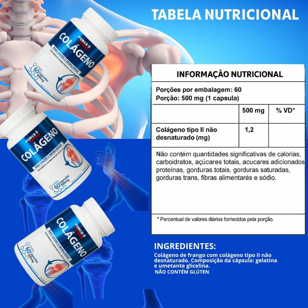 Colágeno Tipo 2 Não Desnaturado Cada Pote Contém : 60 cápsulas _______________________ RECOMENDAÇÕES DE USO : Ingerir : 01 cápsula após o almoço Ingerir : 01 cápsula após o jantar _______________________ Composição : Colágeno Tipo 2 Não Desnaturado ________________________ Conservação : Após aberto, manter a embalagem bem fechada e armazenar em local fresco, seco (15° a 25°) e ao abrigo de luz. Produto lacrado para sua proteção. Não utilizar em caso de violação. Manter fora do alcance de crianças. ________________________ Advertência : Gestantes, idosos, crianças, lactantes e pessoas que apresentam doenças ou alterações fisiológicas, somente devem consumir este produto sob orientação de nutricionista ou médico. ________________________ Advertência : PRODUTO PARA MAIORES DE 19 ANOS __________________________ AVISO : Informamos que todos os nossos produtos e fotos são devidamente registrados no INPI (Instituto Nacional da Propriedade Industrial). Qualquer tentativa de cópia ou reprodução não autorizada estará sujeita a penalidades severas, incluindo o cancelamento e banimento da conta, além de processos legais para resguardar nossos direitos de propriedade intelectual. Valorizamos a originalidade e o respeito aos direitos autorais, por isso pedimos que respeitem a nossa marca e o nosso trabalho.