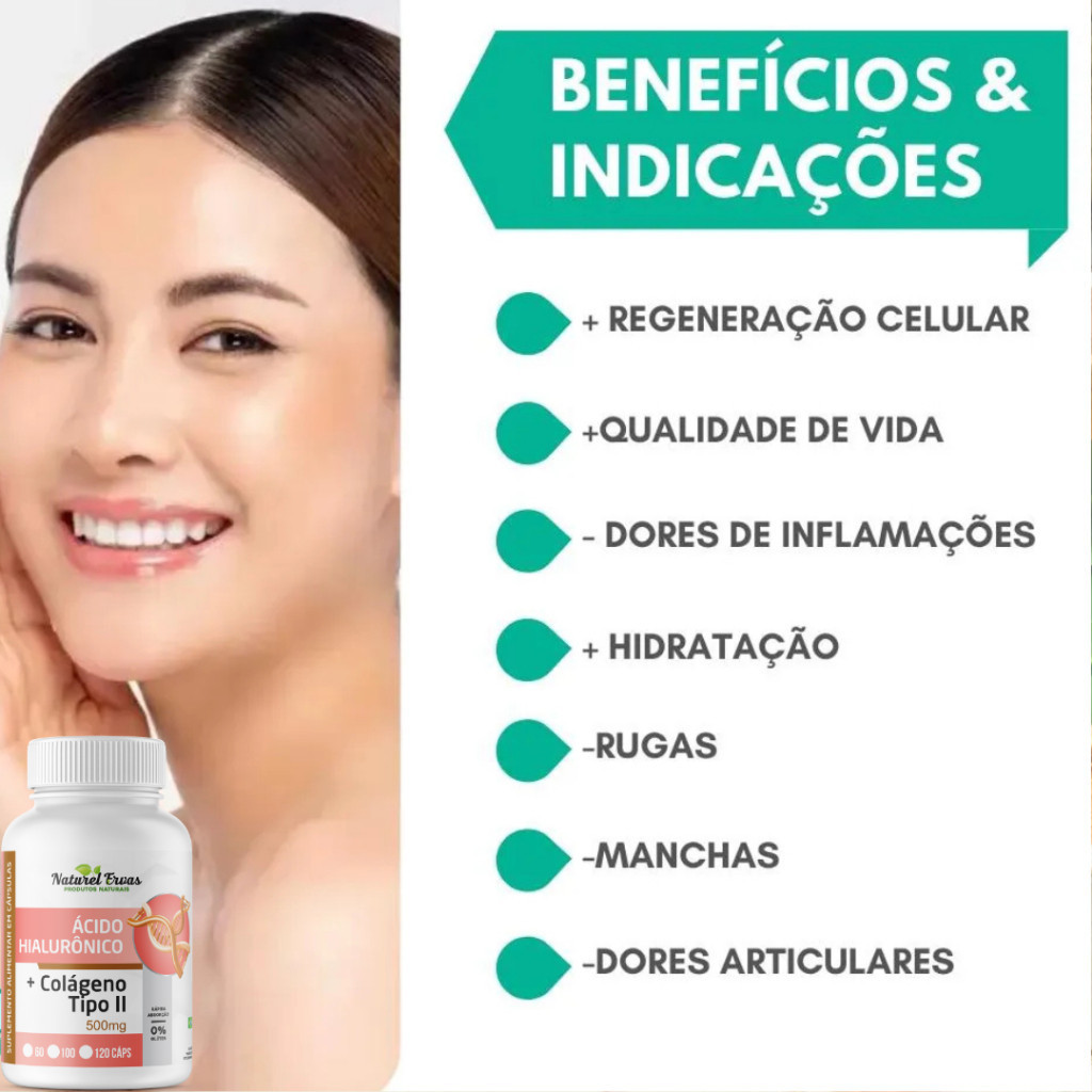 ENVIAMOS NO MESMO DIA! Colágeno Tipo II + Ácido Hialurônico 120 Cáps – Articulações O Colágeno Tipo II + Ácido Hialurônico é essencial para a saúde das articulações, auxiliando na lubrificação, flexibilidade e regeneração da cartilagem. Com 120 cápsulas de 500mg, esse suplemento melhora a mobilidade, reduz o desgaste articular e alivia desconfortos causados pelo impacto diário. O Ácido Hialurônico potencializa a hidratação das articulações, contribuindo para um movimento mais fluido e saudável. Ideal para quem busca proteção articular, suporte ósseo e mais qualidade de vida. Indicado para atletas, idosos e pessoas com desgaste nas articulações. Cuide do seu corpo com a combinação perfeita para articulações mais fortes e saudáveis! Atenção: Não é medicamento! É um suplemento alimentar!
