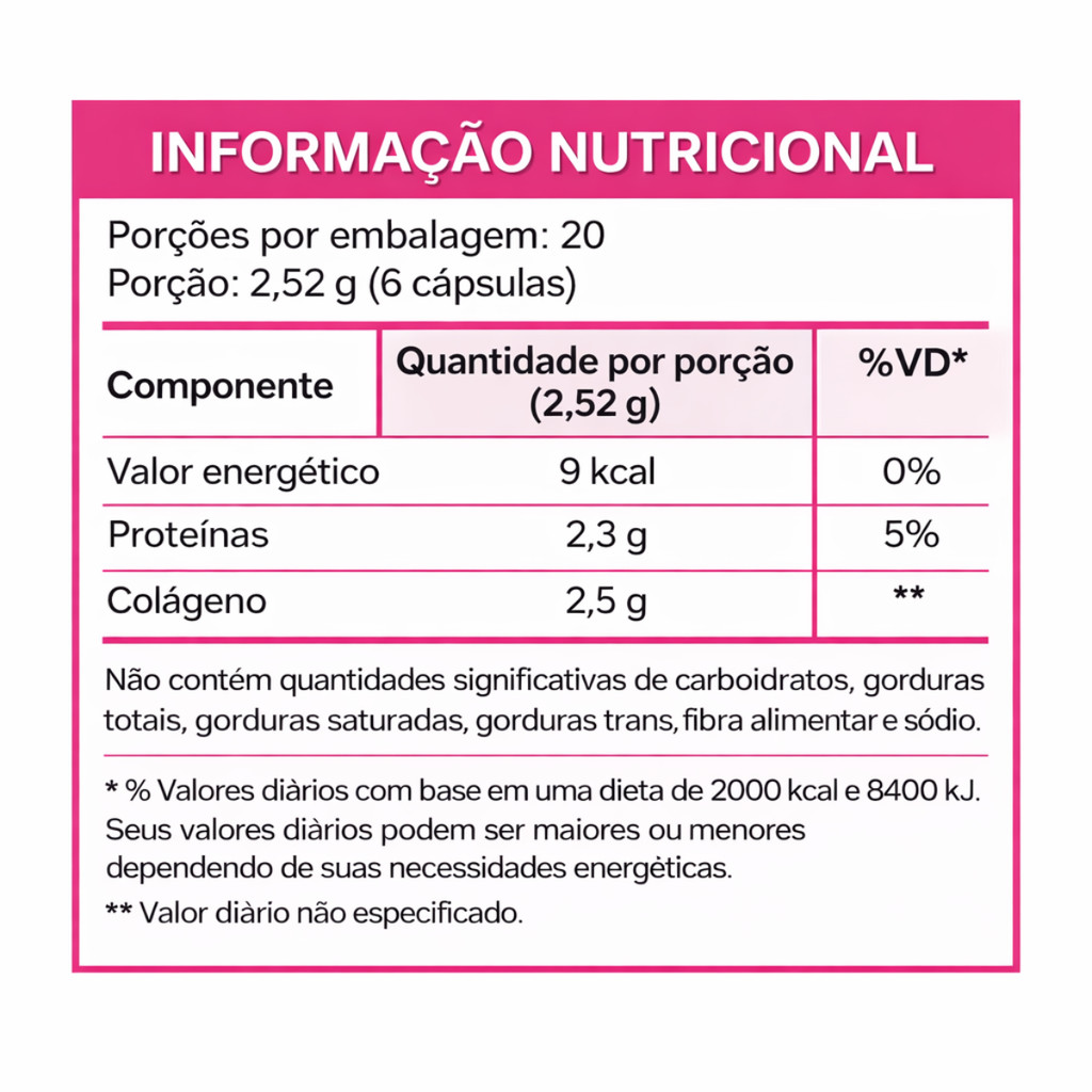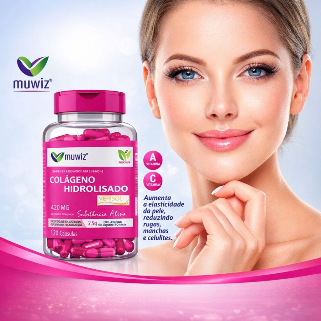 Cuide da sua pele, cabelos e unhas com o Colágeno Hidrolisado Verisol® da Muwiz! Com uma fórmula exclusiva, este suplemento ajuda a estimular a produção natural de colágeno, trazendo mais firmeza, elasticidade e hidratação para sua pele. Cada porção (6 cápsulas) contém 2,5g de colágeno hidrolisado Verisol®, reconhecido por sua alta absorção e eficácia comprovada. Embalagem com 120 cápsulas – Ideal para um mês de uso! Garanta já o seu e sinta a diferença na sua pele! IMPORTANTE: Informações importantes: Este produto não é um medicamento Isento de Registro conforme Resolução Anvisa 240/2018