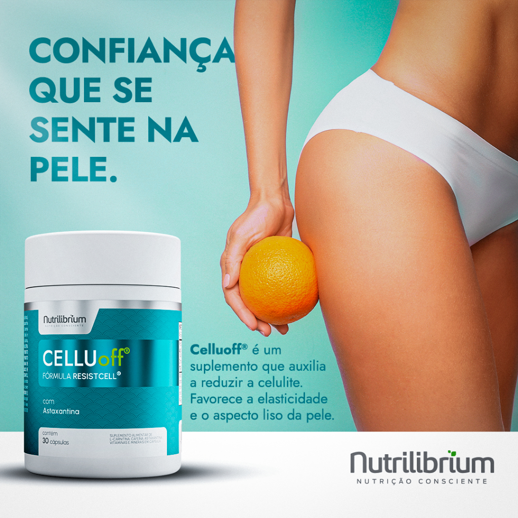 COLLAGEN HIALURON INGREDIENTES: Peptídeos Bioativo de Colágeno Hidrolisado com peso molecular média 2kDa, Ácido Hialurônico (Hialuronato de Sódio), Vitamina C (Ácido Ascórbico), Vitamina E (Acetato de DL-alfa-tocoferol), Zinco (Sulfato de Zinco Monoidratado), Vitamina A (Acetato de Retinol), Biotina (D-Biotina), Selênio (Selenito de Sódio) e Antiumectante Estearato de Magnésio. INGREDIENTES DA CÁPSULA: Gelatina, Água Purificada e Corante Dióxido de Titânio. SUGESTÃO DE USO: Consumir 3 (três) cápsulas 1(uma) vez ao dia. PRODUTO INDICADO PARA MAIORES DE 19 ANOS. ADVERTÊNCIAS: ?ESTE PRODUTO NÃO É UM MEDICAMENTO?. ?NÃO EXCEDER A RECOMENDAÇÃO DIÁRIA DE CONSUMO INDICADA NA EMBALAGEM?. ?MANTENHA FORA DO ALCANCE DE CRIANÇAS?. ?ESTE PRODUTO NÃO DEVE SER CONSUMIDO POR GESTANTES, LACTANTES E CRIANÇAS?. CONSERVAÇÃO: Manter em lugar fresco, não úmido e ao abrigo de luz. Não consumir o produto se o lacre de proteção estiver violado. Após aberto, consumir preferencialmente em 60 dias. __________________________________ CELLUOFF INGREDIENTES: L- Carnitina, Cafeína, Vitamina C (Ácido Ascórbico), Vitamina E (Acetato de D-alfa-tocoferol), Astaxantina (Ésteres de astaxantina de Haematococcus pluvialis), Vitamina B6 (Cloridrato de Piridoxina), Vitamina A (Acetato de Retinol), Zinco (Óxido de Zinco), Selênio (Selenito de Sódio) e Antiumectante Talco Farmacêutico. INGREDIENTES DA CÁPSULA: Gelatina, Água Potável Filtrada e Corante Azul Brilhante. NÃO CONTÉM GLÚTEN SUGESTÃO DE USO: Consumir 1 (uma) cápsula 1 (uma) vez ao dia. PRODUTO INDICADO PARA MAIORES DE 19 ANOS. ADVERTÊNCIAS: ?ESTE PRODUTO NÃO É UM MEDICAMENTO?. ?NÃO EXCEDER A RECOMENDAÇÃO DIÁRIA DE CONSUMO INDICADA NA EMBALAGEM?. ?MANTENHA FORA DO ALCANCE DE CRIANÇAS?. ?ESTE PRODUTO NÃO DEVE SER CONSUMIDO POR GESTANTES, LACTANTES E CRIANÇAS?. CONSERVAÇÃO: Manter em lugar fresco, não úmido e ao abrigo de luz. Não consumir o produto se o lacre de proteção estiver violado. Após aberto, consumir preferencialmente em 60 dias.