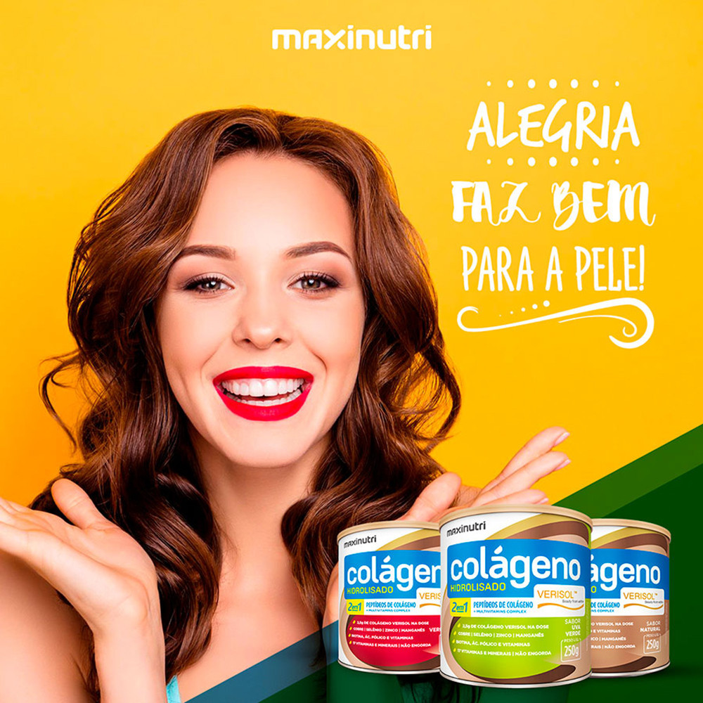 Colágeno Verisol Maxinutri Lata 250g Sabor Uva Verde Ingredientes: Peptídeos de colágeno (Verisol®), ácido cítrico (acidulante), citrato de sódio (regulador de acidez), polidextrose, dióxido de silício (antiumectante), mix de minerais e vitaminas: Biotina, Ácido Fólico, Ferro, Cobre, Manganês, Vitamina A, Vitamina B1, Vitamina B2, Vitamina B3, Vitamina B5, Vitamina B6, Vitamina B12, Vitamina C, Vitamina D3, Vitamina E, Selênio e Zinco, edulcorante: stevia, aroma idêntico ao natural de frutas vermelhas, corante caramelo e vermelho bordeaux. NÃO CONTÉM GLÚTEN. Modo de preparo: Adicionar 10g (2 colheres dosadoras rasas) de Colágeno em 250ml de água ou bebida de sua preferência e mexer até completa dissolução. Beba imediatamente após o preparo. Conservação e Advertência: Conservar ao abrigo da luz, calor e umidade. Após aberto consumir em até 60 dias. Produto indicado para o Grupo Populacional igual ou maior que 19 anos. Não exceder a recomendação diária de consumo indicada na embalagem. Mantenha fora do alcance de crianças. Registro MS - Not. 16.6144 Autorização Ministério da Saúde 6.05821-8 Farmacêutico Responsável CRF/PR 13.469