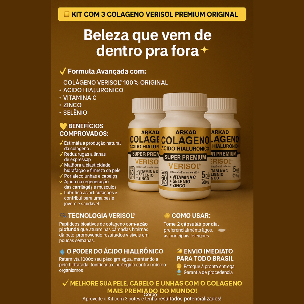 🟨 KIT COM 3 COLÁGENO VERISOL PREMIUM ORIGINAL 🟨 ✨ Beleza que vem de dentro pra fora ✨ ✅ Fórmula Avançada com: COLÁGENO VERISOL® 100% ORIGINAL ÁCIDO HIALURÔNICO VITAMINA C ZINCO SELÊNIO 💛 BENEFÍCIOS COMPROVADOS: ✔️ Estimula a produção natural de colágeno ✔️ Reduz rugas e linhas de expressão ✔️ Melhora a elasticidade, hidratação e firmeza da pele ✔️ Fortalece unhas e cabelos ✔️ Ajuda na regeneração das cartilagens e músculos ✔️ Lubrifica as articulações e contribui para uma pele jovem e saudável 🧬 TECNOLOGIA VERISOL® Peptídeos bioativos de colágeno com ação profunda que atuam nas camadas internas da pele, promovendo resultados visíveis em poucas semanas. 💧 O PODER DO ÁCIDO HIALURÔNICO Retém até 1000x seu peso em água, mantendo a pele hidratada, tonificada e protegida contra micro-organismos. 🕒 COMO USAR: Tome 2 cápsulas por dia, preferencialmente após as principais refeições. 🔒 SEGURANÇA E QUALIDADE Produto 100% ORIGINAL Não contém glúten Livre de conservantes Registro na ANVISA Lacre de segurança inviolado 🚀 ENVIO IMEDIATO PARA TODO BRASIL 📦 Estoque à pronta entrega 📍 Garantia de procedência 👩⚕️ Indicado para maiores de 19 anos ✅ MELHORE SUA PELE, CABELO E UNHAS COM O COLÁGENO MAIS PREMIADO DO MUNDO! Aproveite o Kit com 3 potes e tenha resultados potencializados!